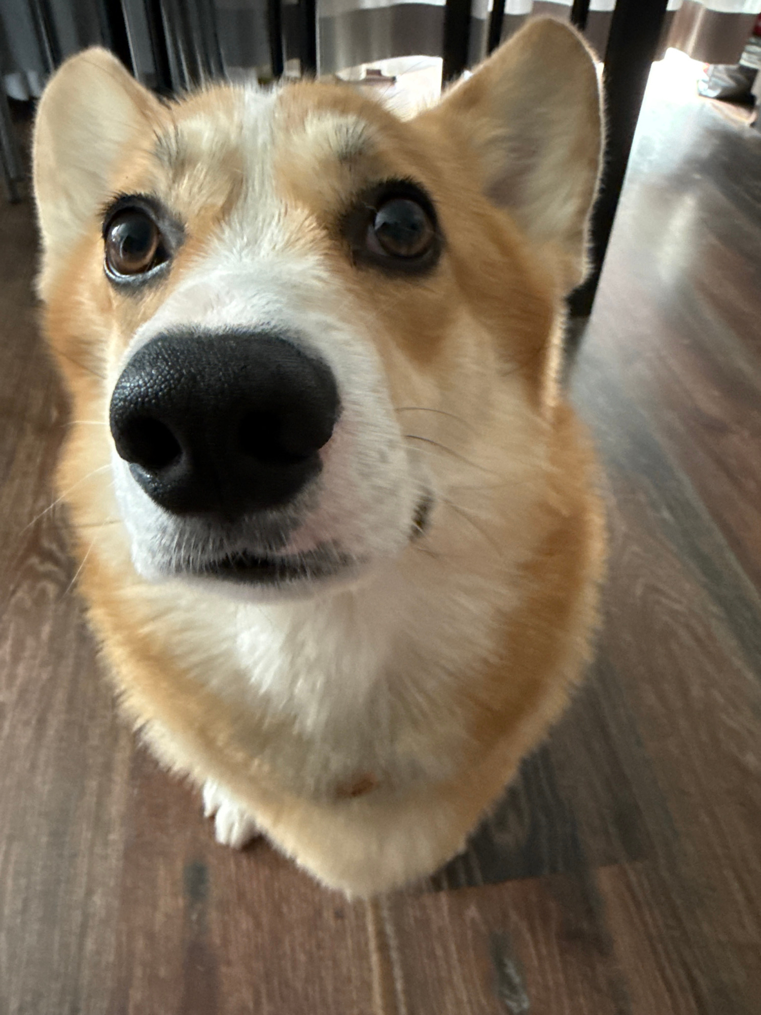 A tan and white Pembroke Welsh Corgi dog is pictured from a high angle, looking upward toward the camera. The dog has dark eyes and a large, black nose. The background is a dark wood-grain surface. A…read more