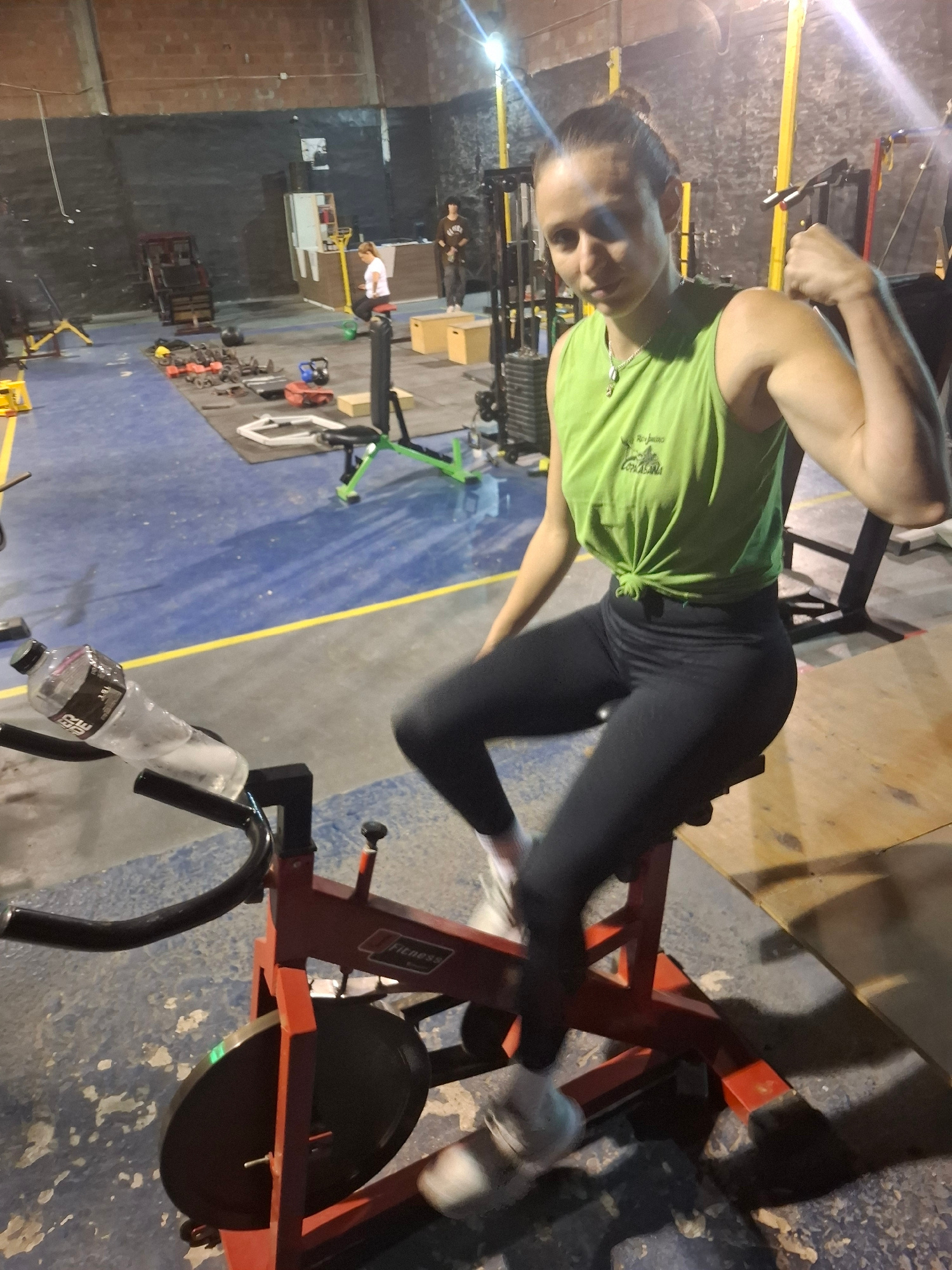 A woman is on an exercise bike in a gym setting. She wears a green T-shirt, black leggings, and white sneakers. She is turned sideways, looking at the camera, and flexing her right bicep. A water bott…read more