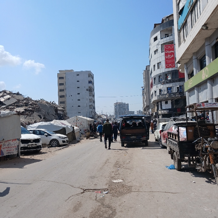 The image depicts an urban street scene in Gaza City, Palestinian Territory, likely on Omar Al-Mukhtar Street. The sky is clear blue with some scattered white clouds in the upper left. On the left si…read more