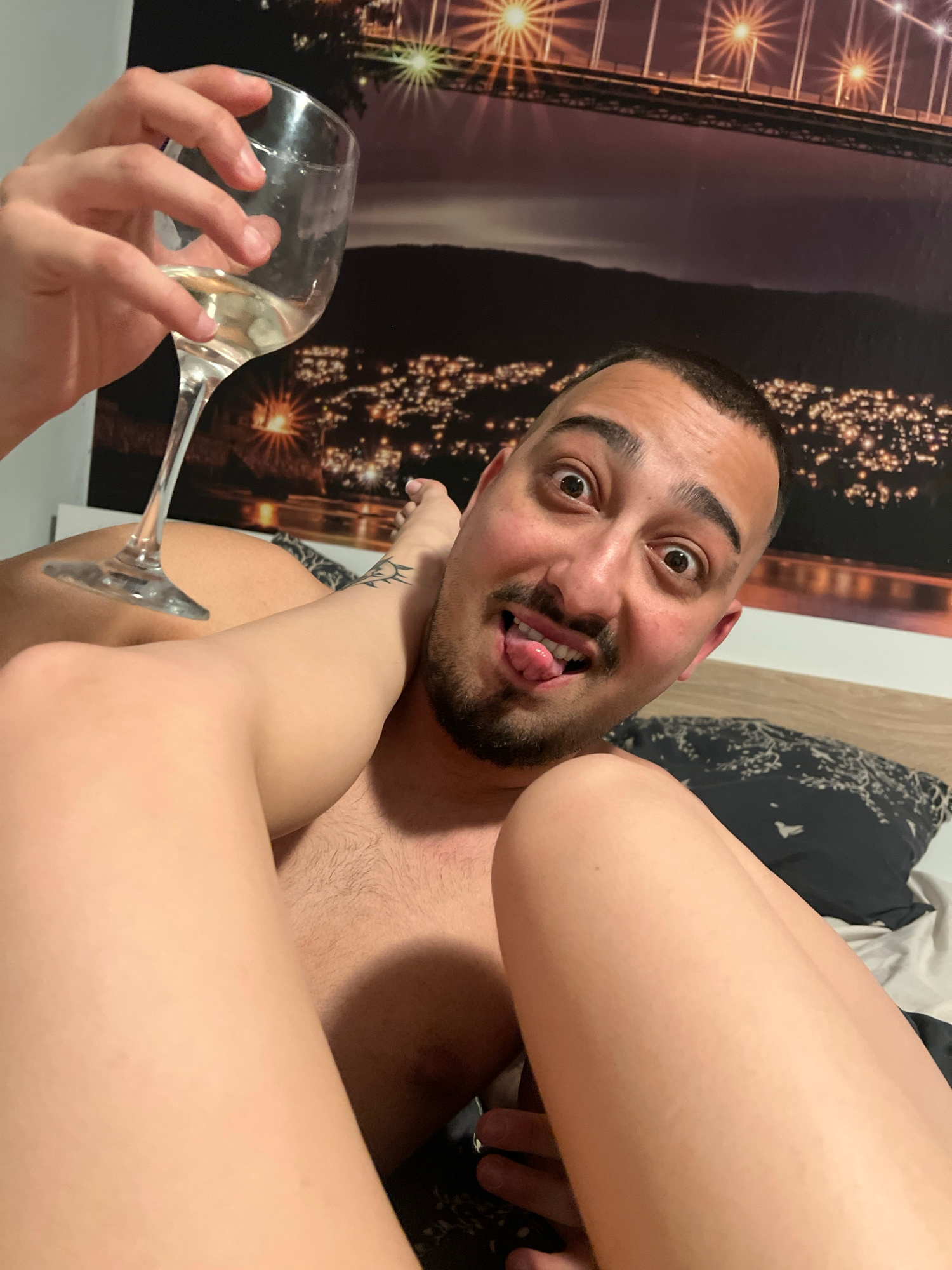 A man with short dark hair and a beard is holding a wine glass filled with a clear liquid in his left hand. He is shirtless and appears to be lying down in a bed. His mouth is open, and he is sticking…read more