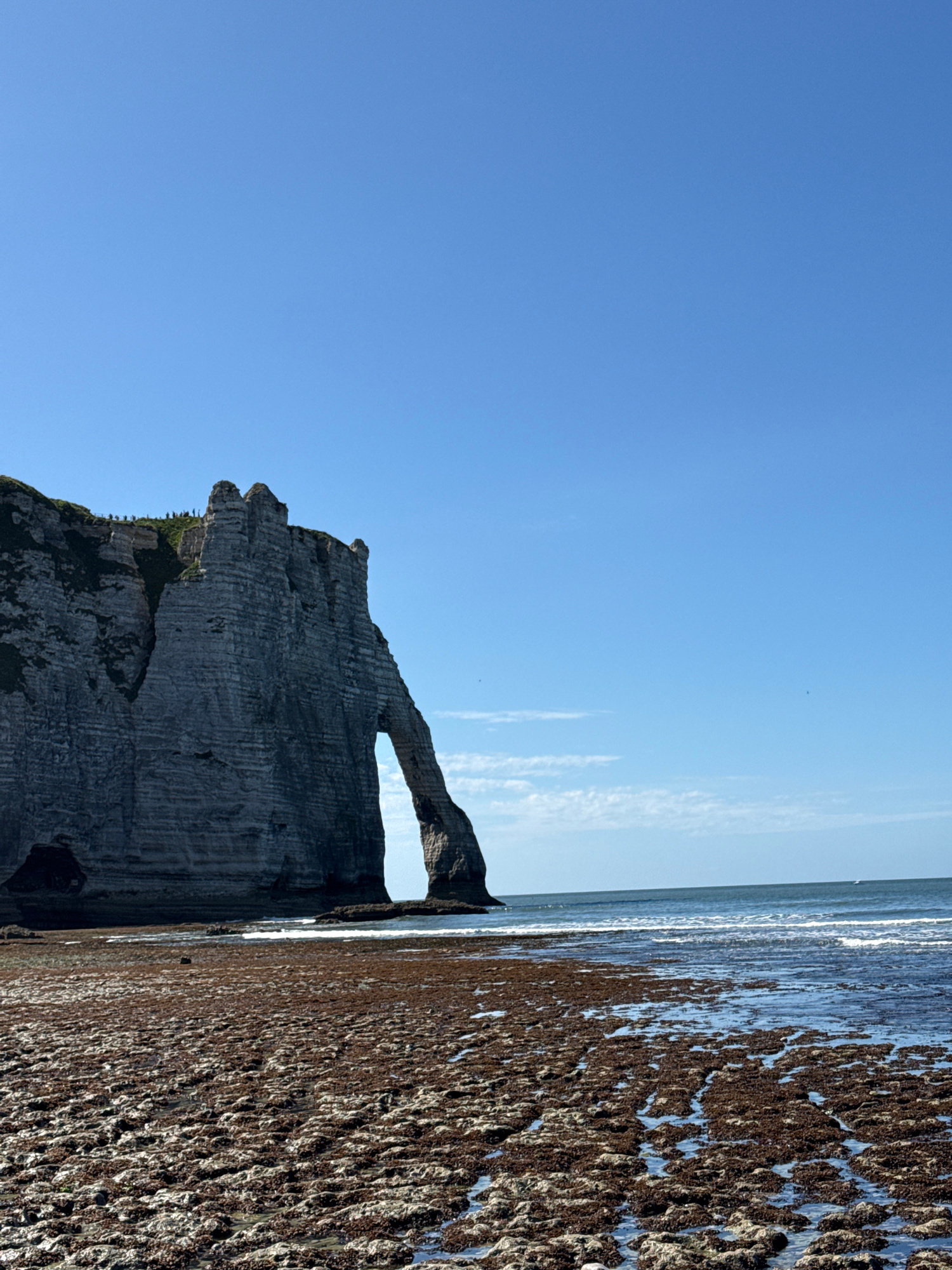 This image captures a breathtaking coastal landscape, strongly indicative of Étretat, France, featuring its iconic white chalk cliffs and natural arches. The main subject is a towering rock formation…read more