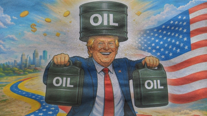 An upside-down caricature of Donald Trump is centered. He holds two green gas cans labeled "OIL" and has his head resting in a larger green oil barrel labeled "OIL". The American flag is behind Trump'…read more