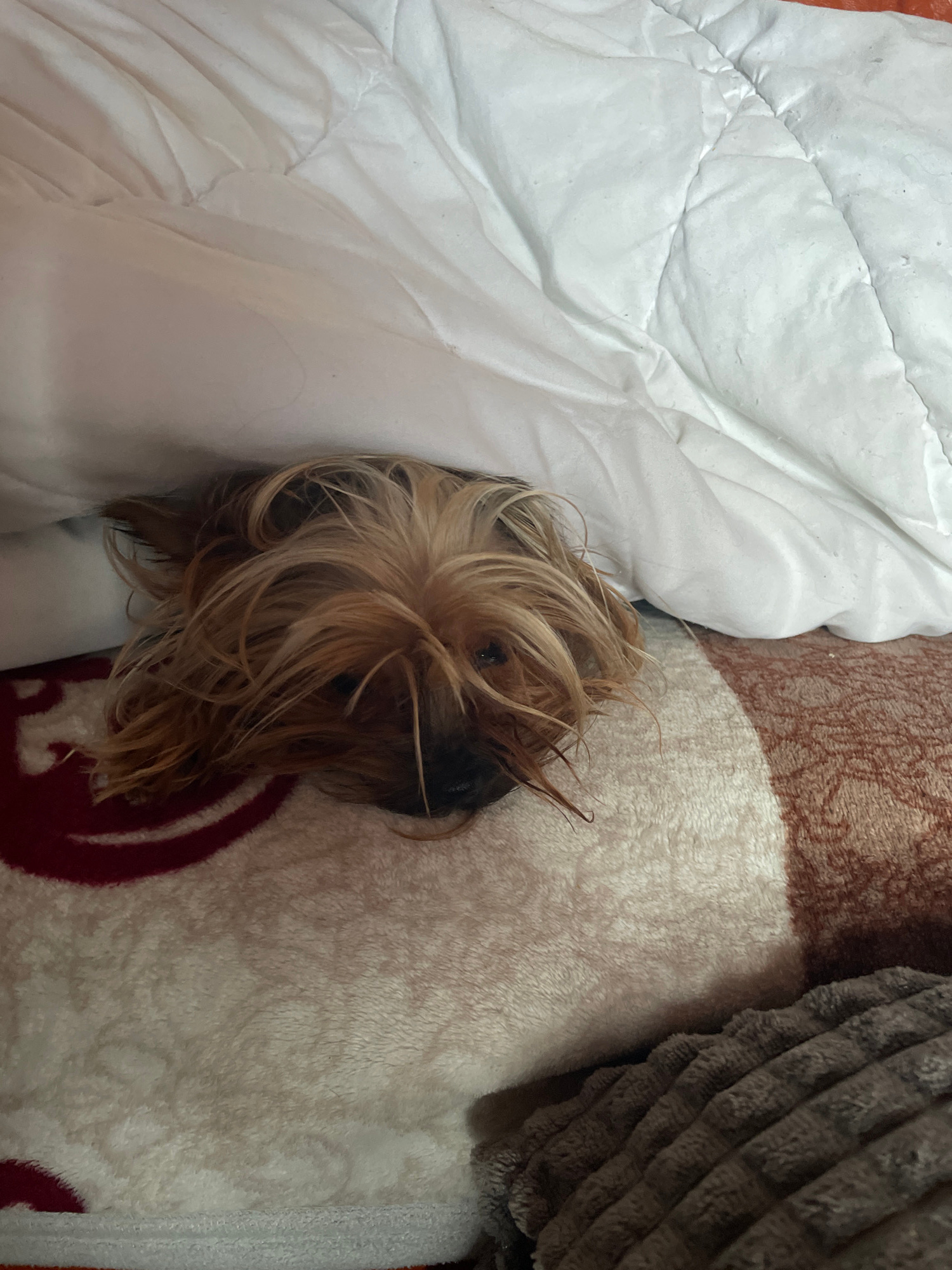 A tan and black Yorkshire Terrier dog lies on a fluffy white blanket with a red circular pattern, next to a white duvet with a quilted pattern and a brown corduroy pillow. The dog's head and upper bod…read more