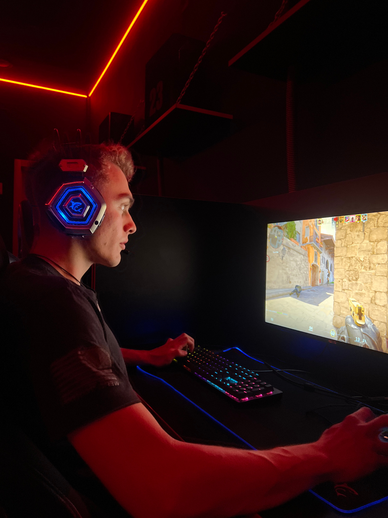 A young man with short, light-brown hair is reclining in a dark room, looking up at a screen displaying a first-person shooter video game. He wears a pair of headphones with a hexagonal design illuminated in blue and red. His hands are positioned as if operating a keyboard and mouse. The keyboard features multi-colored illuminated keys. The screen above him shows a game environment with light-colored stone walls and structures. Red neon lights are visible on the left of the frame, suggesting an entertainment venue. While the city of Budva, Montenegro is not explicitly visible in this image, the interior design and gaming equipment indicate a possible gaming facility or internet cafe commonly found in urban areas. | Open Wire