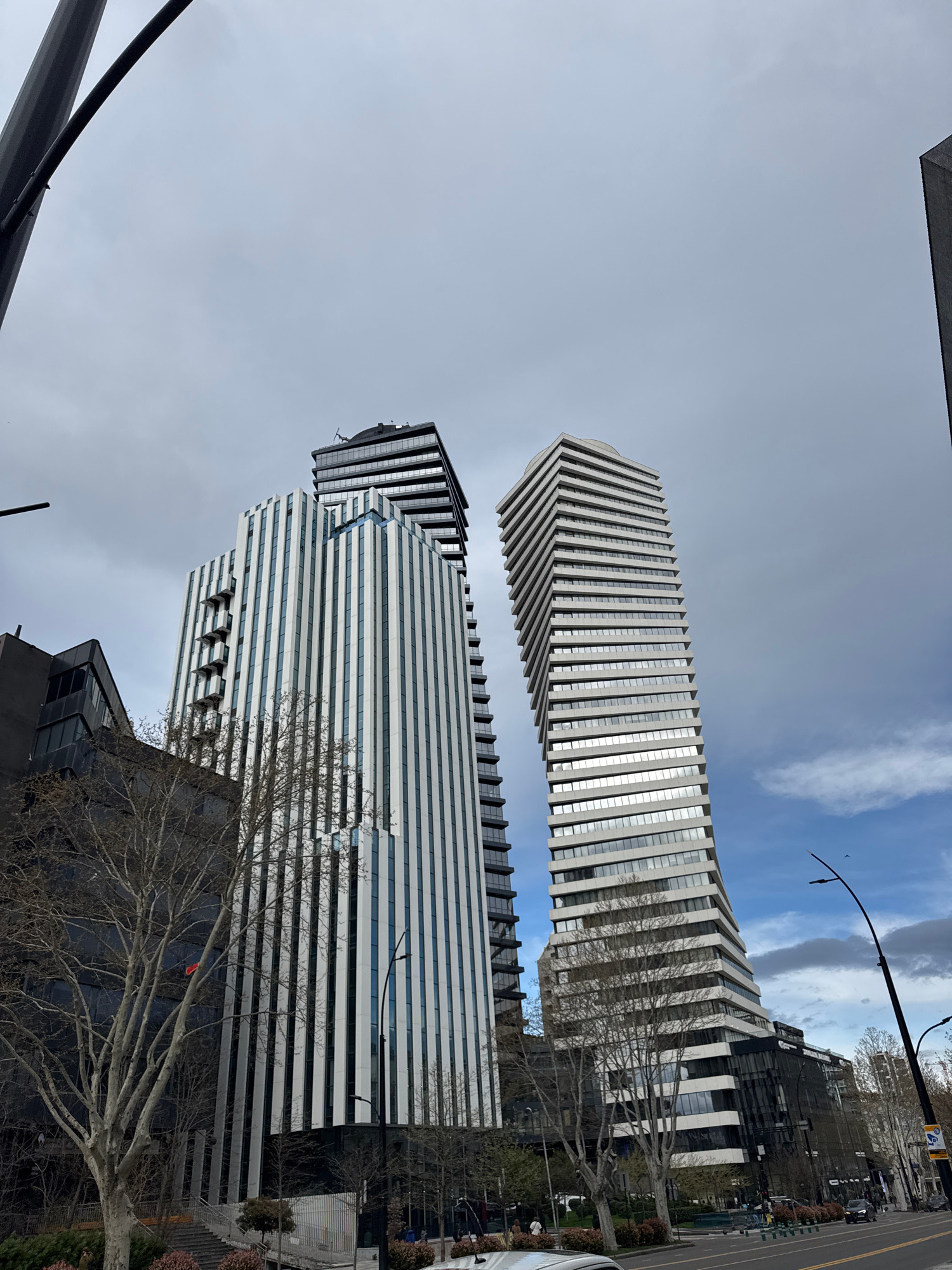 The image shows two tall, modern buildings in Tbilisi, Georgia. The buildings are characterized by their striped, horizontally patterned facades, consisting of alternating white and dark bands. The sk…read more