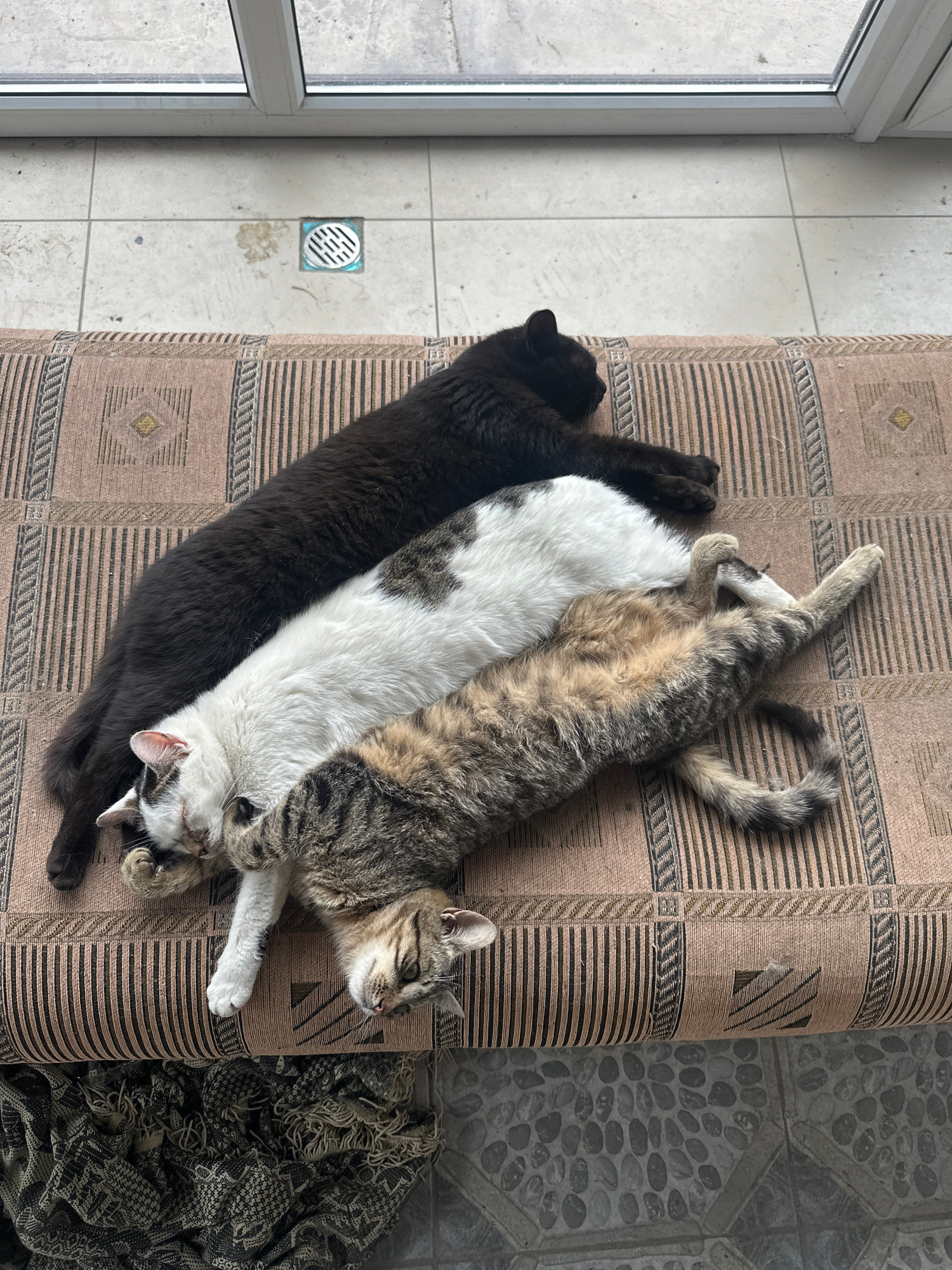 Three cats are lying on a beige and brown patterned rug. The cats are arranged linearly: a black cat on the left, a white cat with dark spots in the center, and a grey tabby cat on the right. The rug…read more