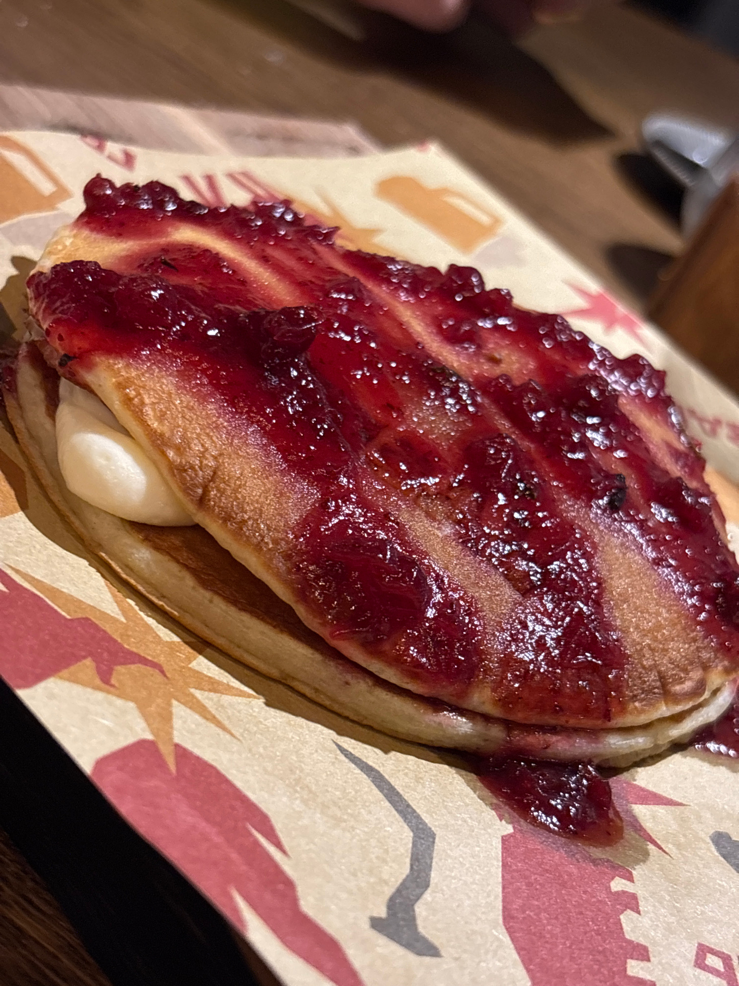 A close-up shot depicts a small stack of pancakes, likely two, with a white, creamy filling between them. The top pancake is covered with a thick, dark red jam or berry topping. The pancakes sit on a…read more
