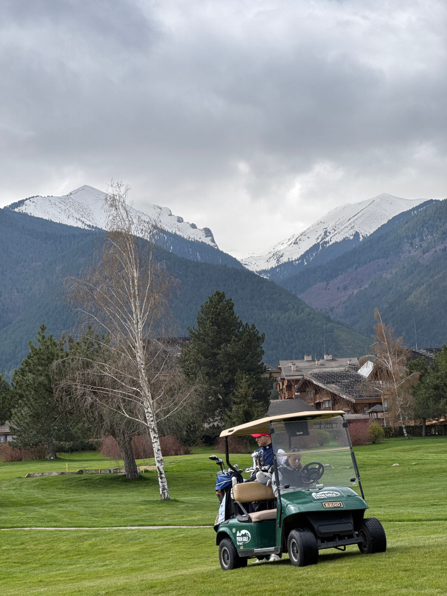A landscape photograph taken near Razlog, Bulgaria shows a golf course with mountains in the background under a cloudy sky. The mountains are covered in snow. In the foreground, there is a green golf…read more