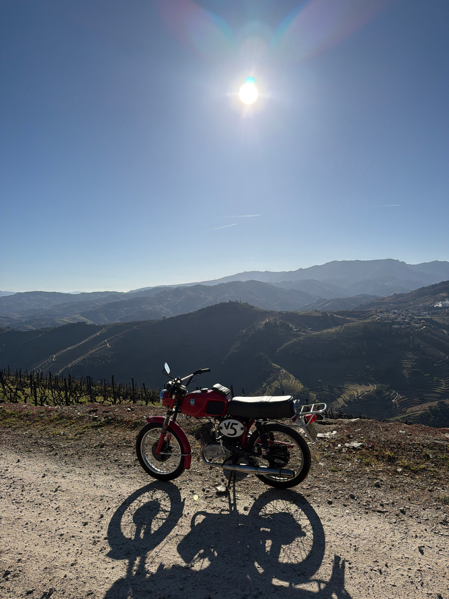 The image captures a red motorcycle parked on a dirt road, likely in a rural setting near Vila Real, Portugal. The motorcycle has the number "5" visible on its side. The ground is a mix of dirt and lo…read more