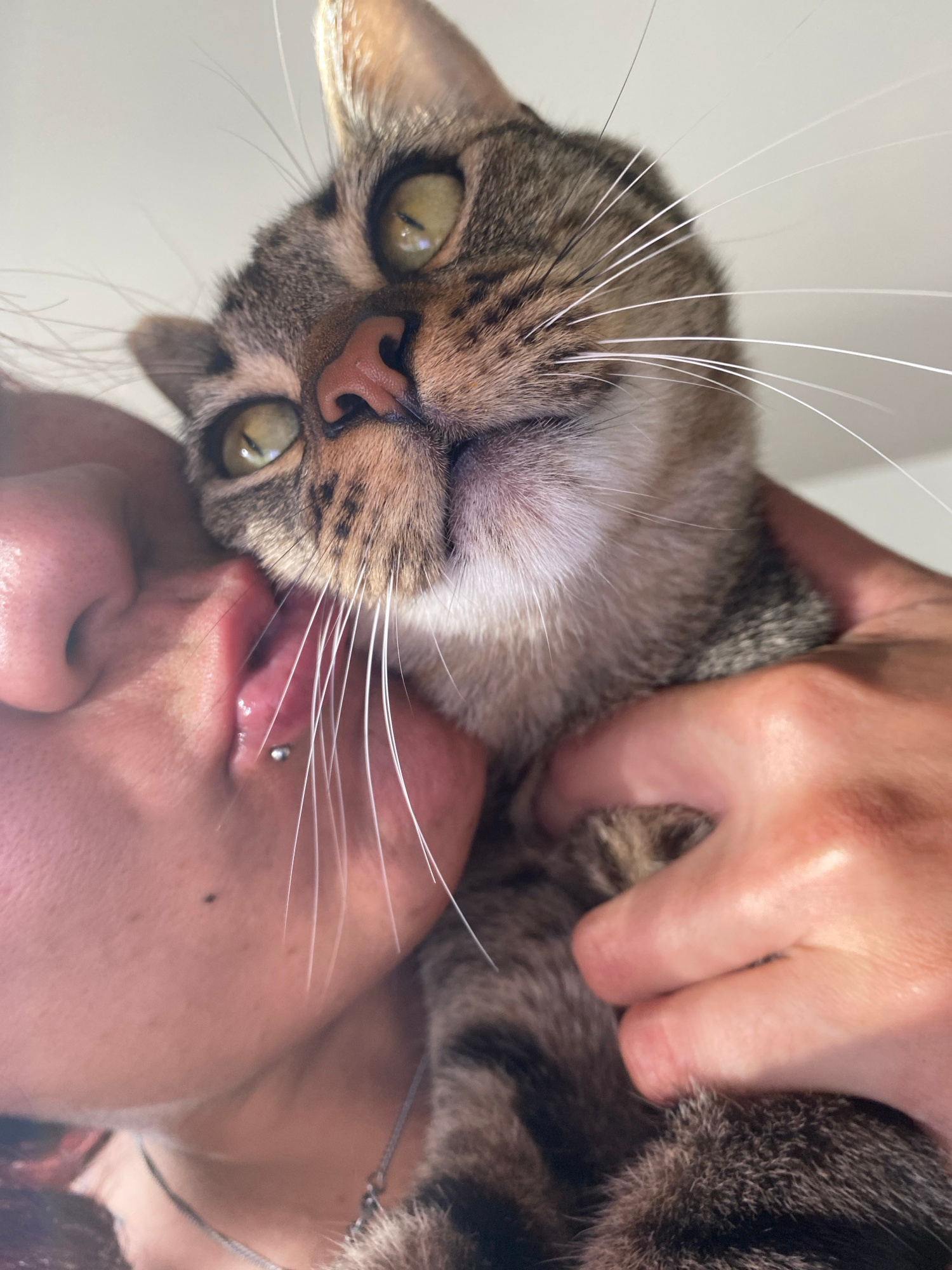 A close-up, low-angle shot features a person holding a brown tabby cat close to their face. The cat's head is tilted, with its face dominating the upper half of the frame. The person's face is visible…read more