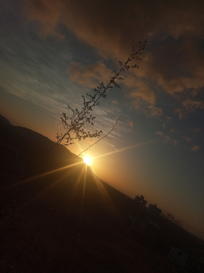 The image depicts an outdoor scene at either sunrise or sunset, captured with a significant rightward tilt. The sun is positioned low on the horizon, slightly left of the image's vertical center, part…read more