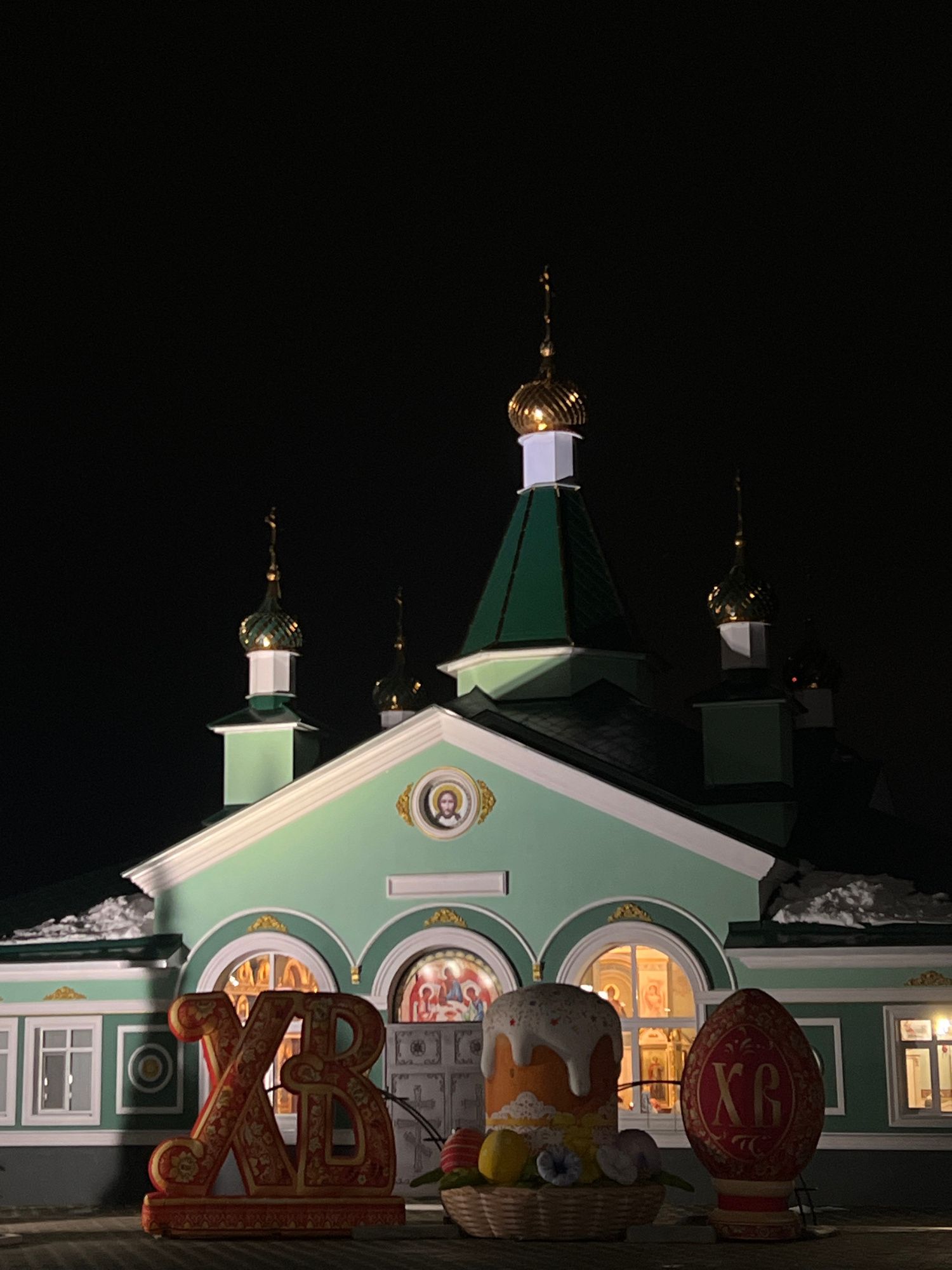 A nighttime shot features a green church, likely in Chaikovsky, Russia, with multiple golden domes. Easter-themed decorations, including a painted egg, a basket, and Cyrillic letters, are attached to…read more