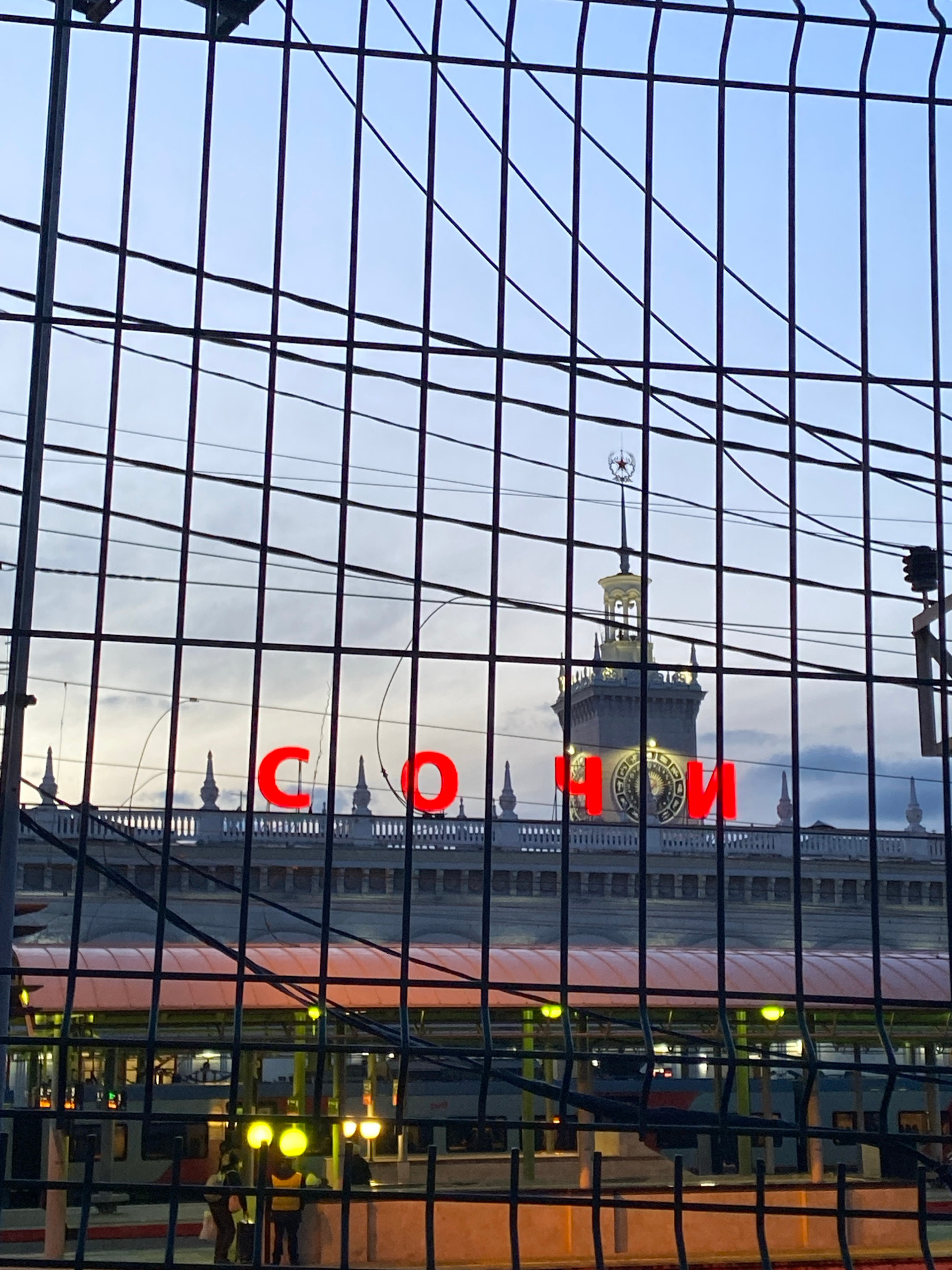 The image shows a partial view of the Sochi Sea Port building in Russia, seen through a metal fence. The building's clock tower and the word "СОЧИ" (Sochi) in red letters are visible. The sky is overc…read more