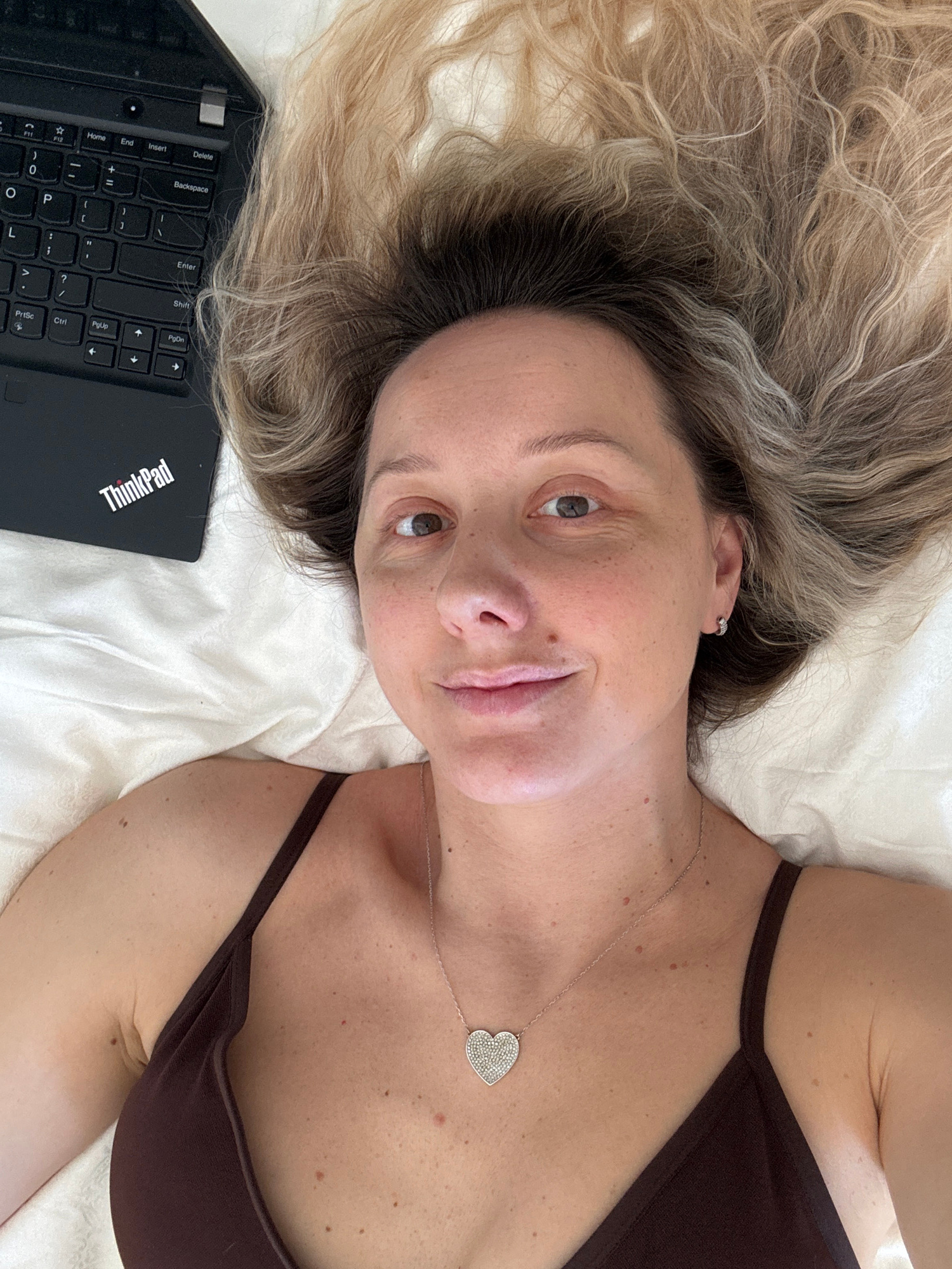 The image is a close-up selfie of a fair-skinned woman lying on her back in what appears to be a bed with white sheets. She has blonde and brown hair that is spread out around her head. She is wearing…read more