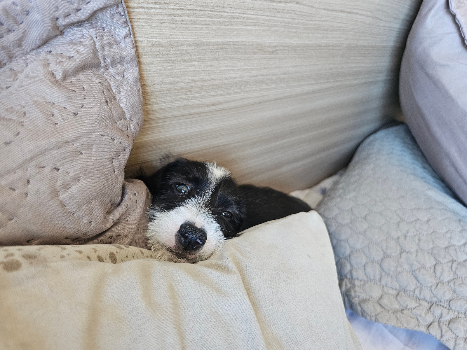 A black and white puppy lies nestled between beige pillows and a gray quilt in what appears to be a domestic setting. The environment suggests a bedroom or living area, but no landmarks or elements ar…read more