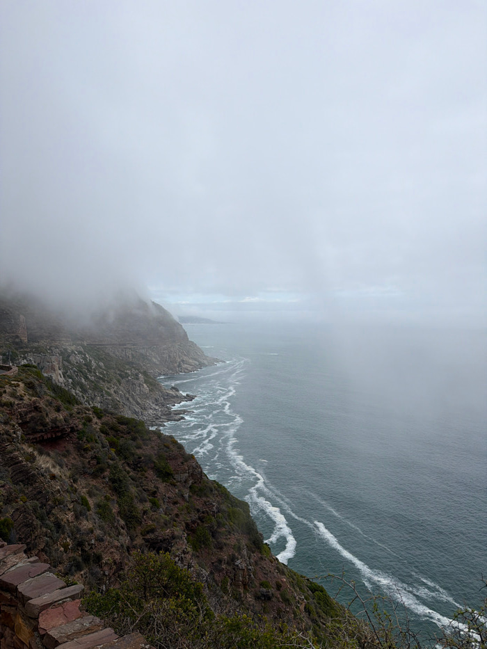 The image displays a coastal landscape on Chapman's Peak Drive, located between Hout Bay and Noordhoek in Cape Town, South Africa. The scene is characterized by dense, low-hanging fog and overcast con…read more