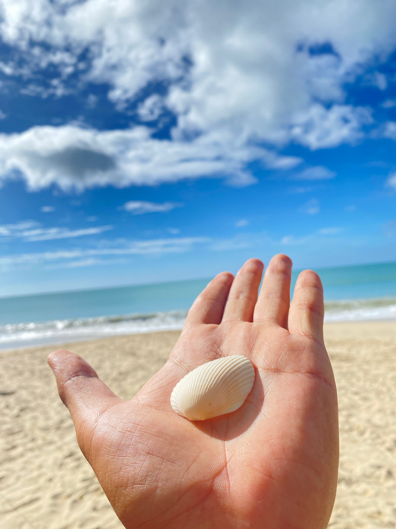 A sunlit photograph taken at Pedro González, Venezuela, shows a person's open palm holding a small, white, ridged seashell. The hand faces towards the horizon, where a pale sandy beach meets a calm, l…read more