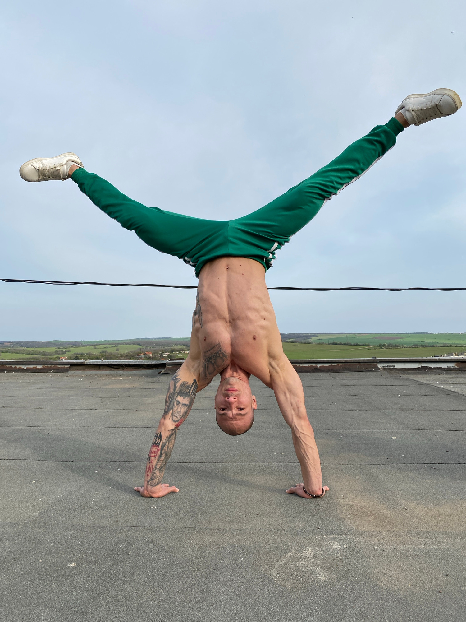 A muscular man with tattoos is performing a handstand split outdoors. He is wearing green sweatpants and white sneakers. He is balancing on his hands on a grey surface, possibly a rooftop. Beyond the…read more