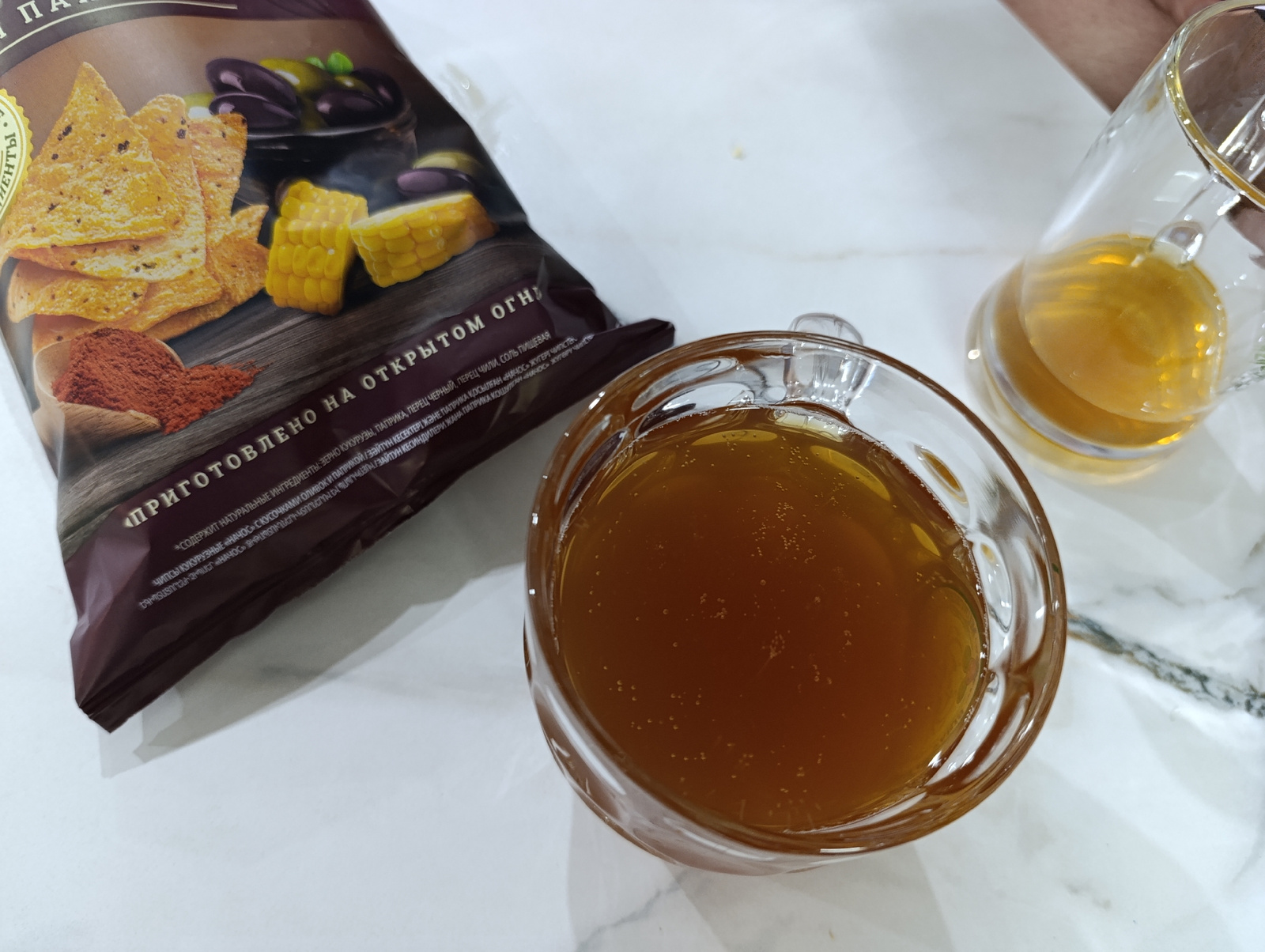 The image shows a bag of nachos chips, a mug and a small pitcher filled with a light brown liquid (likely tea or juice) on a white, marble-patterned surface. The bag of chips has an image of nachos, c…read more