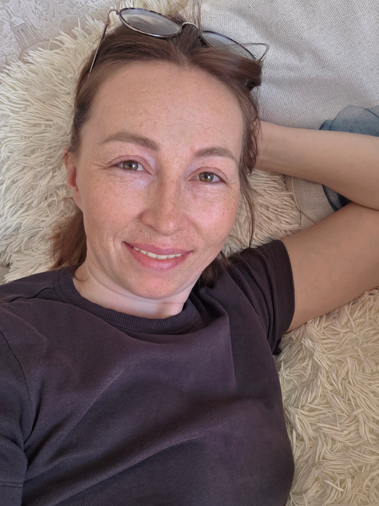 A fair-skinned woman with red hair and freckles lies on her side on a white, fluffy rug or blanket. She wears a dark purple t-shirt and smiles at the camera. A pair of glasses rests on the rug near he…read more