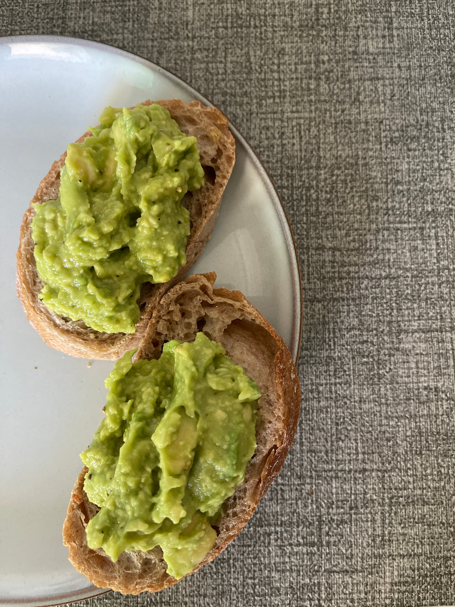 The image shows two slices of avocado toast on a white plate with a gray rim. The bread appears to be whole wheat. The plate is set on a gray textured surface. There are no people visible in the image…read more