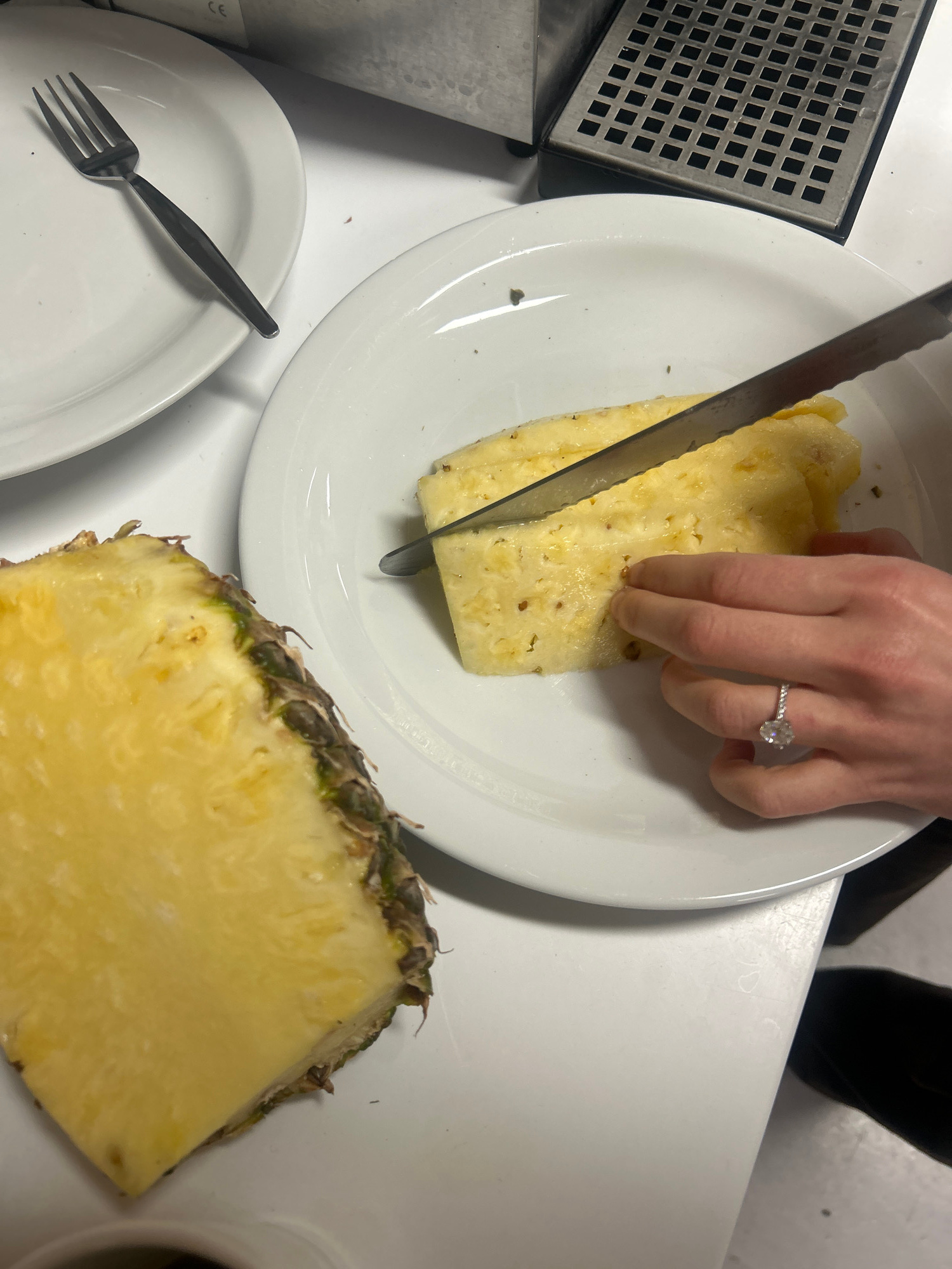 A section of pineapple is being sliced with a knife on a white plate. A hand with a diamond ring is steadying the pineapple. Another section of pineapple is on the counter next to the plate. A fork is…read more