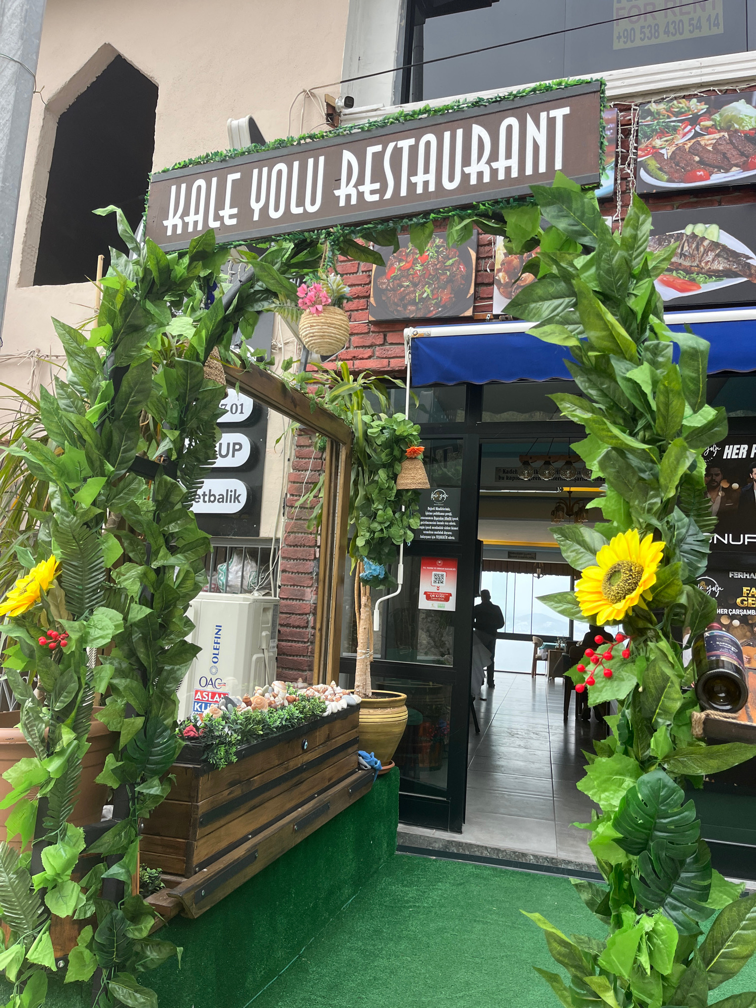The image, rotated 90 degrees clockwise, shows the highly decorated entrance of the "KALE YOLU RESTAURANT" during what appears to be daytime. The restaurant features a glass storefront with a blue awn…read more