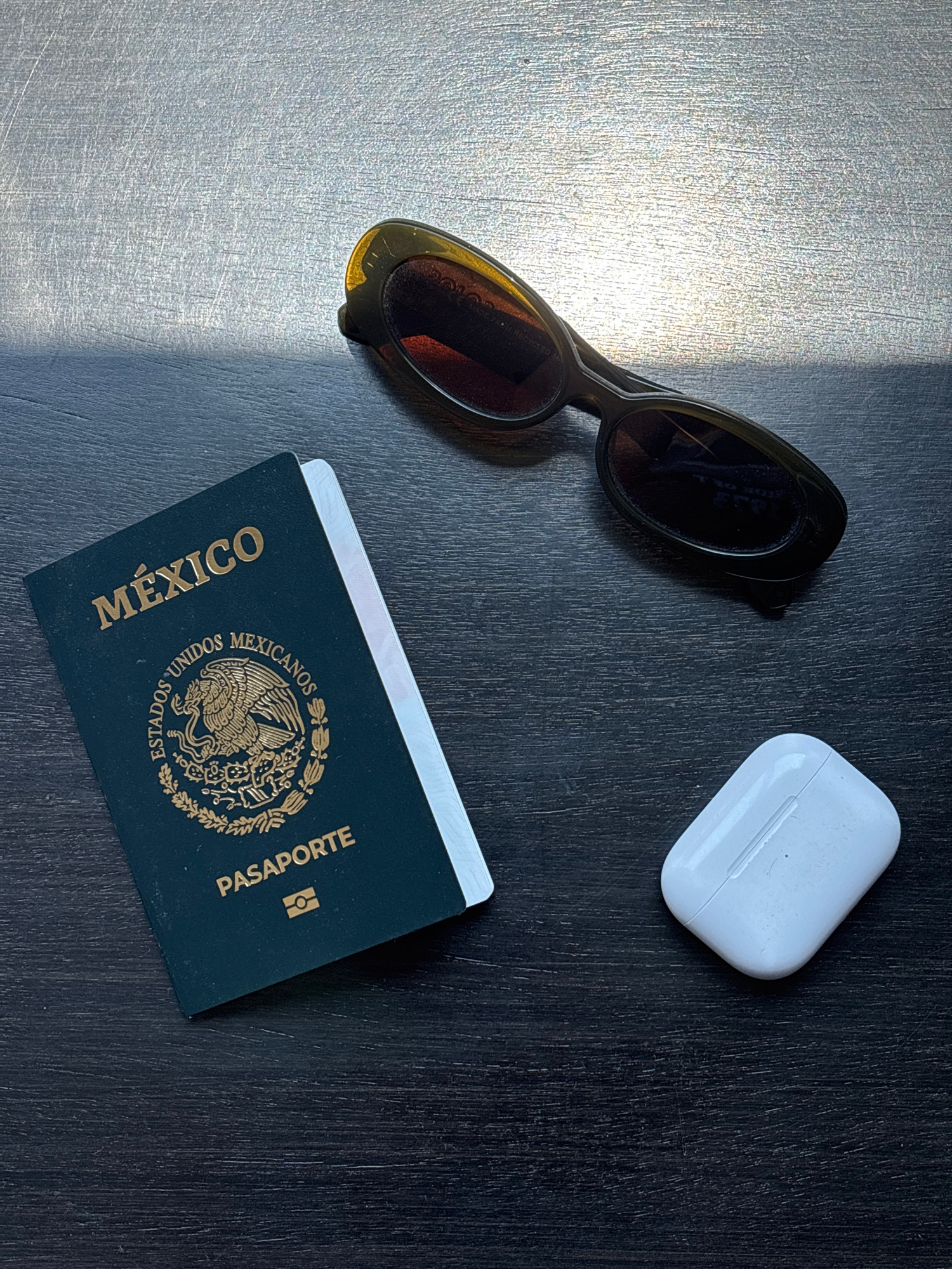 The image shows a dark, possibly wooden, textured surface with objects arranged on it. A pair of sunglasses with dark lenses and a dark-colored frame is positioned on the left. Next to the sunglasses,…read more