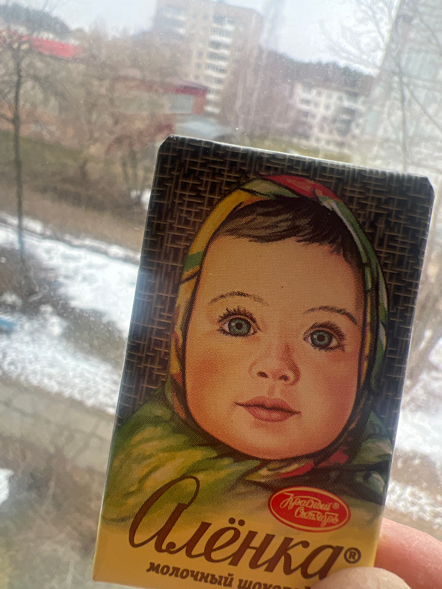 Here is a description of the image: A partially rotated close-up shot shows a rectangular chocolate bar wrapper with a portrait of a young girl. The girl has light skin, a small nose, and light eyes.…read more