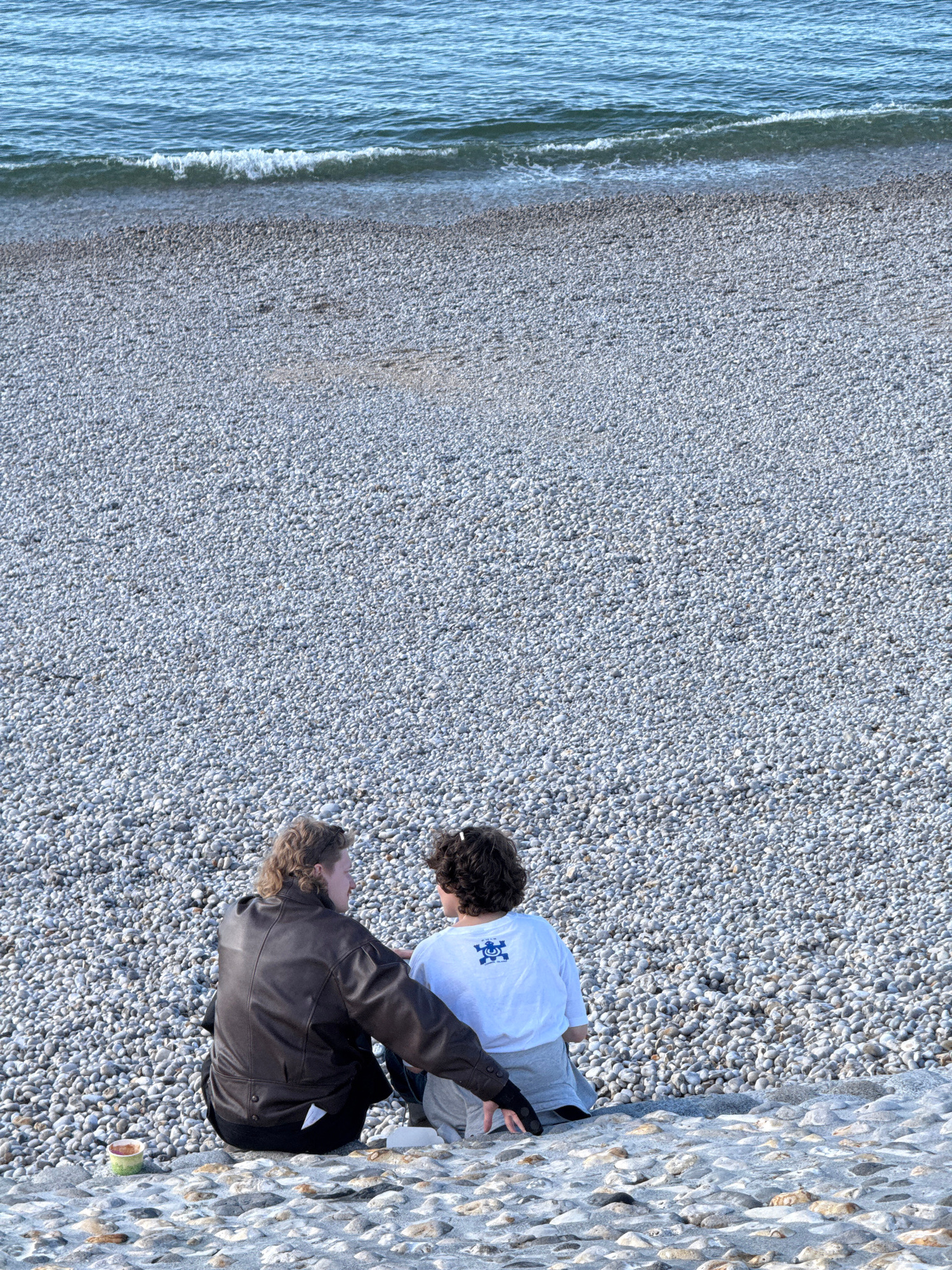 Two individuals are positioned on a pebble beach, adjacent to a cliff face, in Étretat, France. One person is wearing a brown leather jacket, black pants, and sneakers. The second person is wearing a…read more