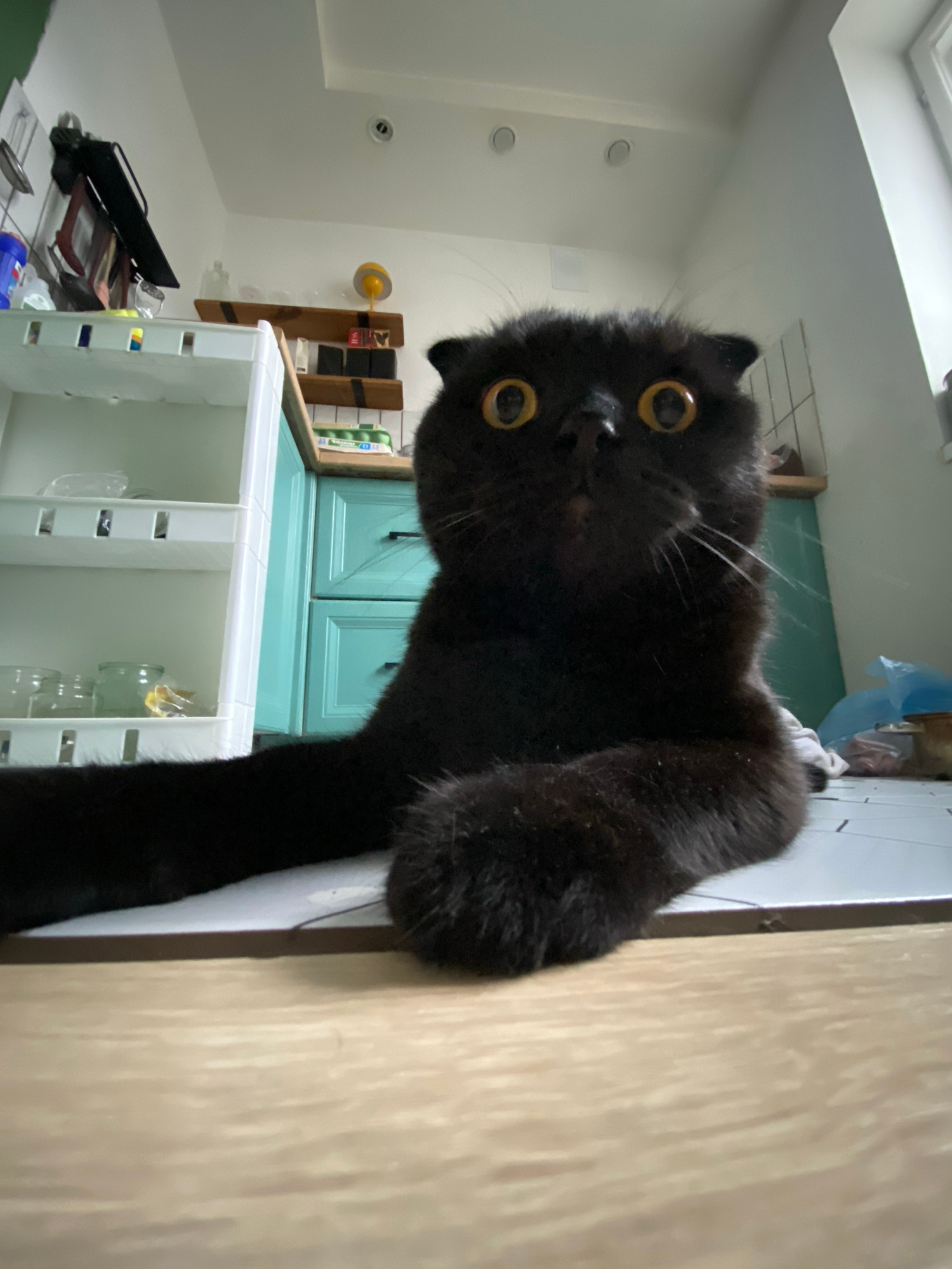 A black cat is the primary subject, facing the camera with wide, golden eyes. The cat's fur appears fluffy. The background includes a kitchen setting with white cabinets, light blue cabinets, and shel…read more