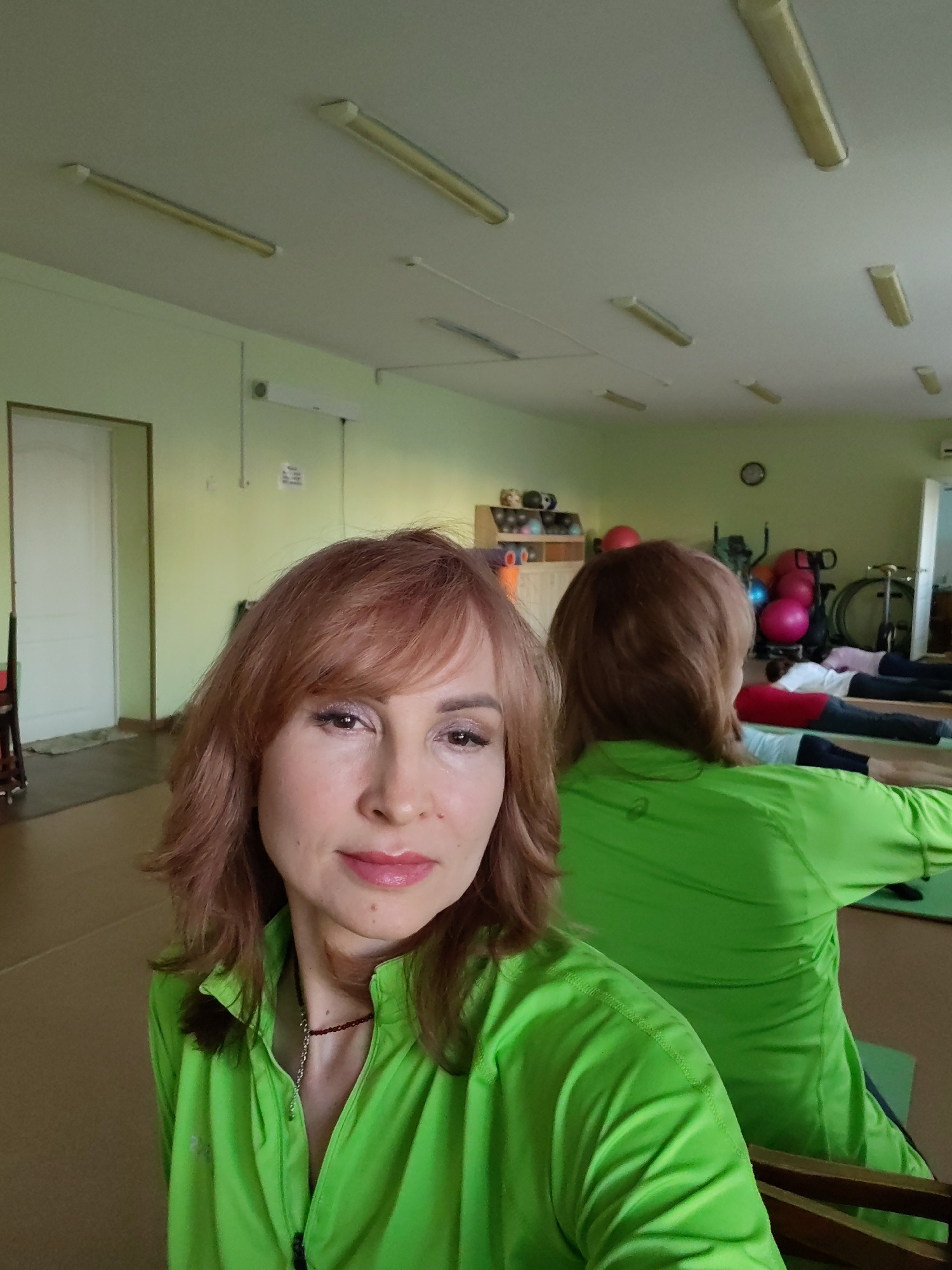 A woman with reddish-brown shoulder-length hair wearing a bright green zip-up shirt is taking a selfie in what appears to be a studio or fitness room in Chaikovsky, Russia. The room has light green wa…read more