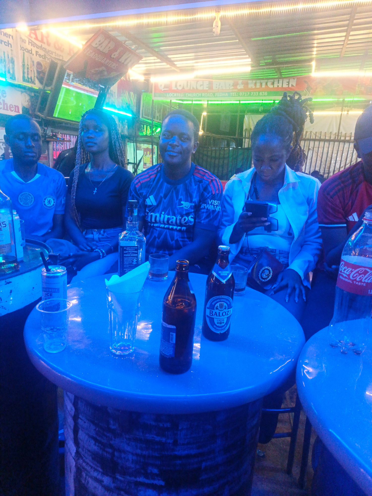 The image depicts a group of five people seated around two round tables at an outdoor bar or lounge. The environment appears to be nighttime, with a neon blue light casting a strong hue over the scene…read more