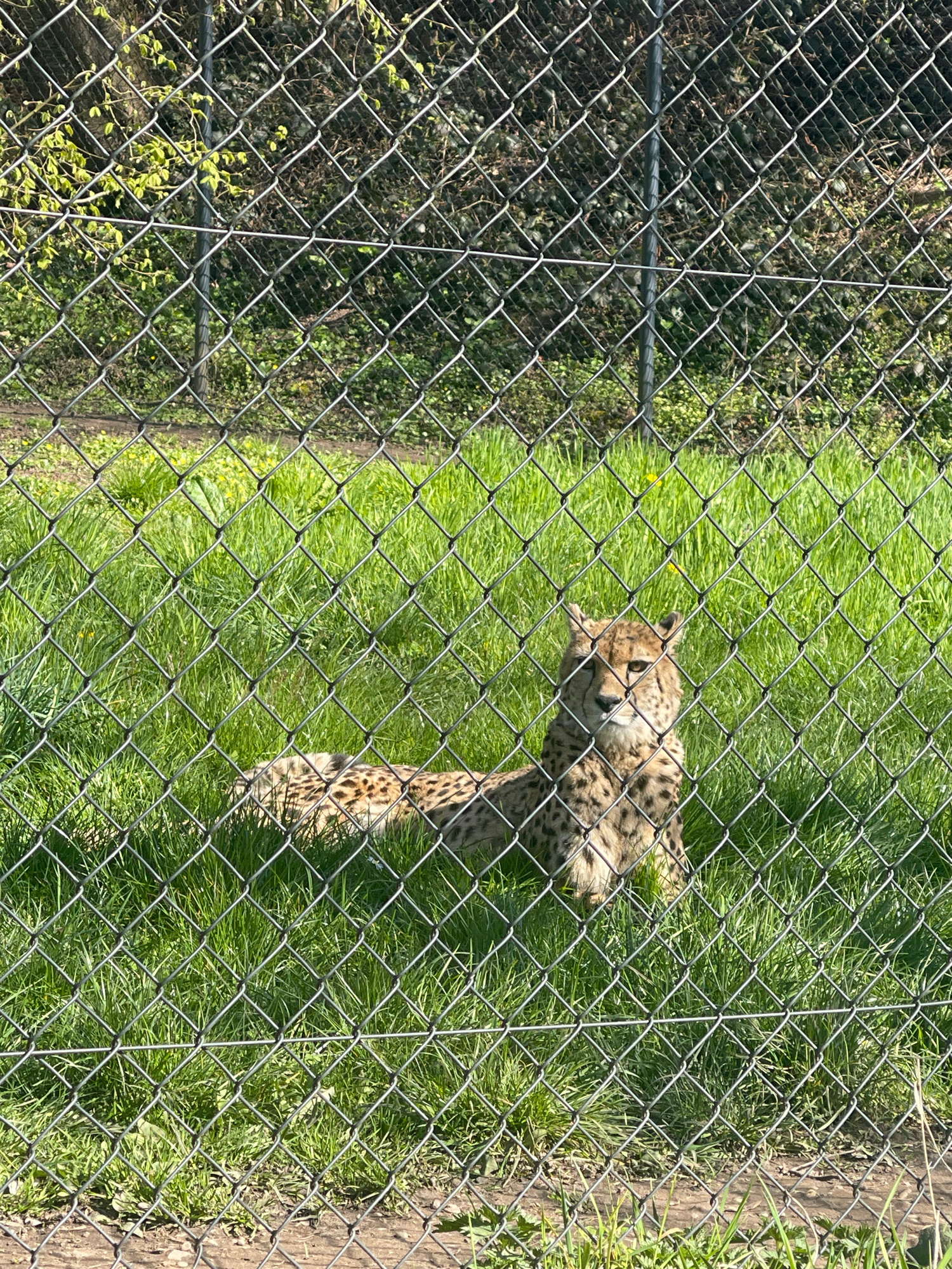 A cheetah is lying in the grass behind a chain-link fence. The fence is on the left side of the image, and the cheetah is in the center of the image. The grass is green and lush. The image was likely…read more