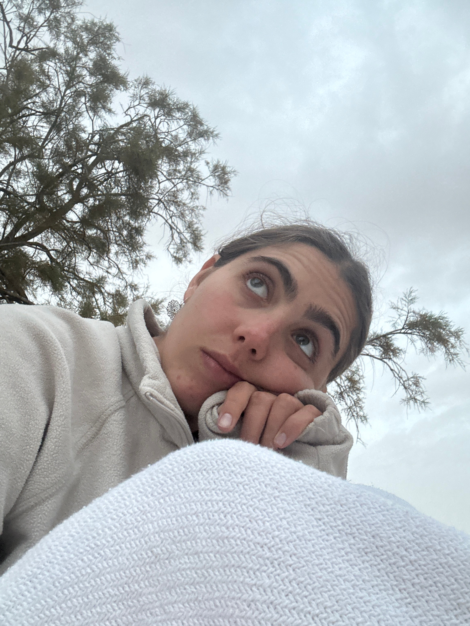 A low-angle shot captures a woman outdoors against a cloudy sky, with two trees framing her. The woman rests her cheek on her hand, with a slightly contemplative expression. She is wearing a light-col…read more