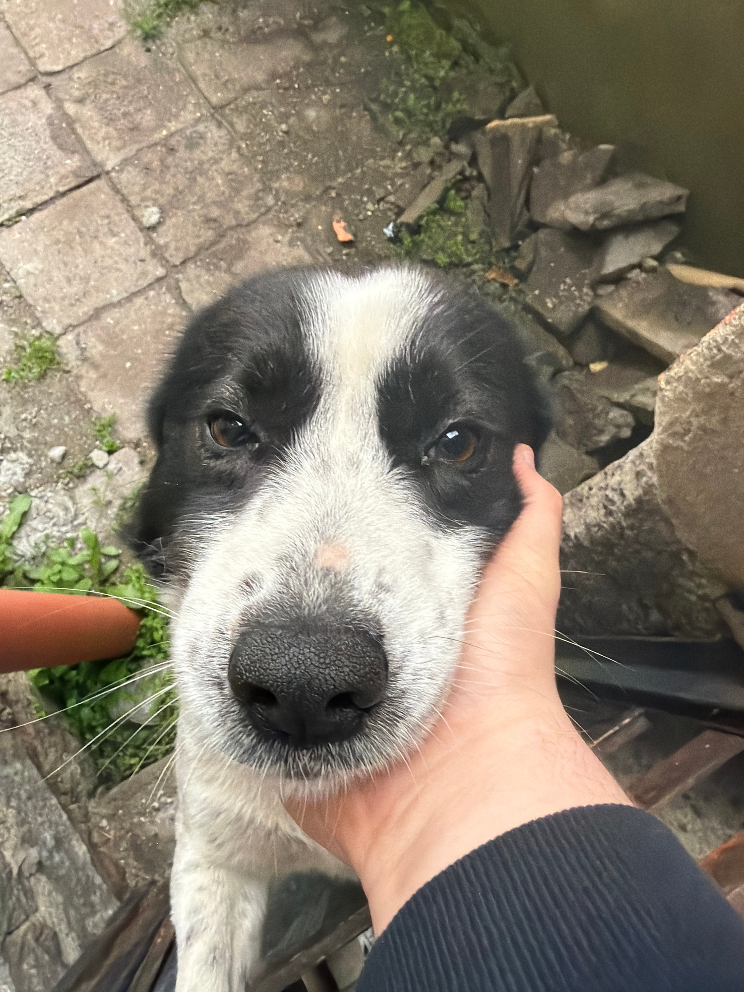 A close-up, overhead shot depicts a black and white dog being petted by a fair-skinned hand. The dog is looking upwards, with a large black nose and visible white whiskers. The hand is positioned on t…read more