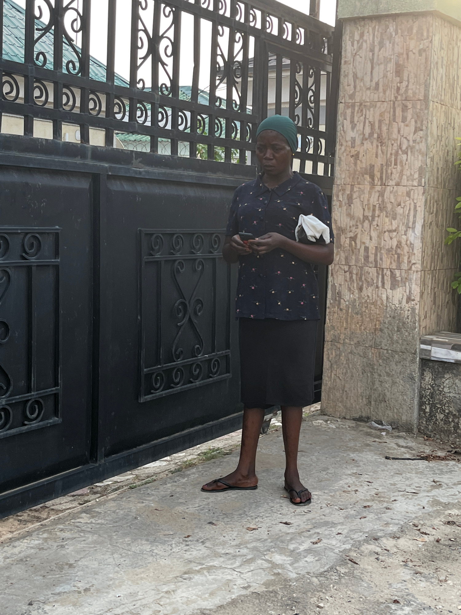An elderly woman stands in front of a black wrought-iron gate on a concrete walkway in Abuja, Nigeria. She wears a dark, patterned blouse, a dark skirt, a green head covering, and dark sandals. She is…read more