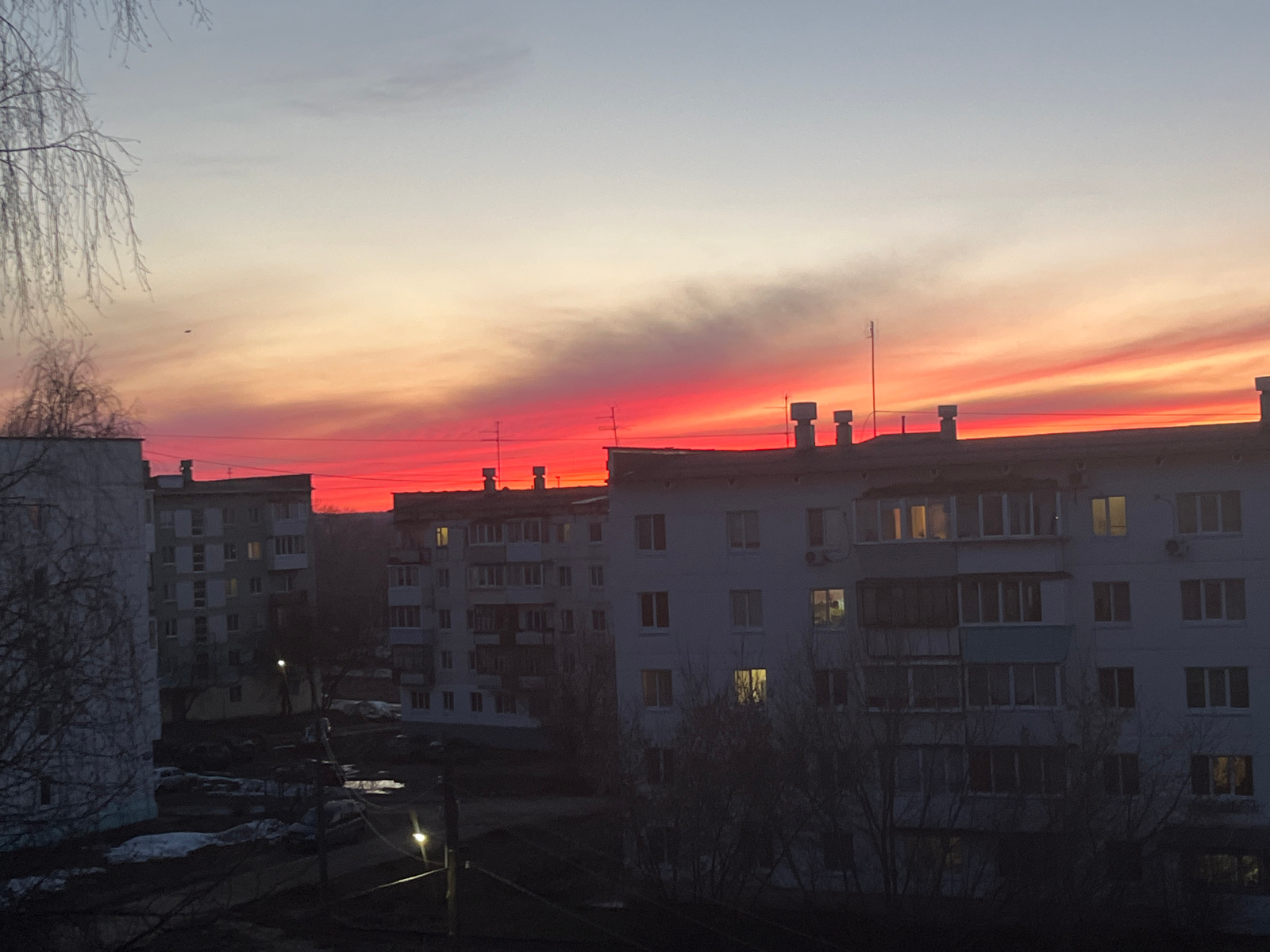 The image depicts a twilight or dawn scene over a residential area in Chaikovsky, Russia. Multiple Soviet-era apartment buildings dominate the view, silhouetted against a vibrant sky with hues of red,…read more