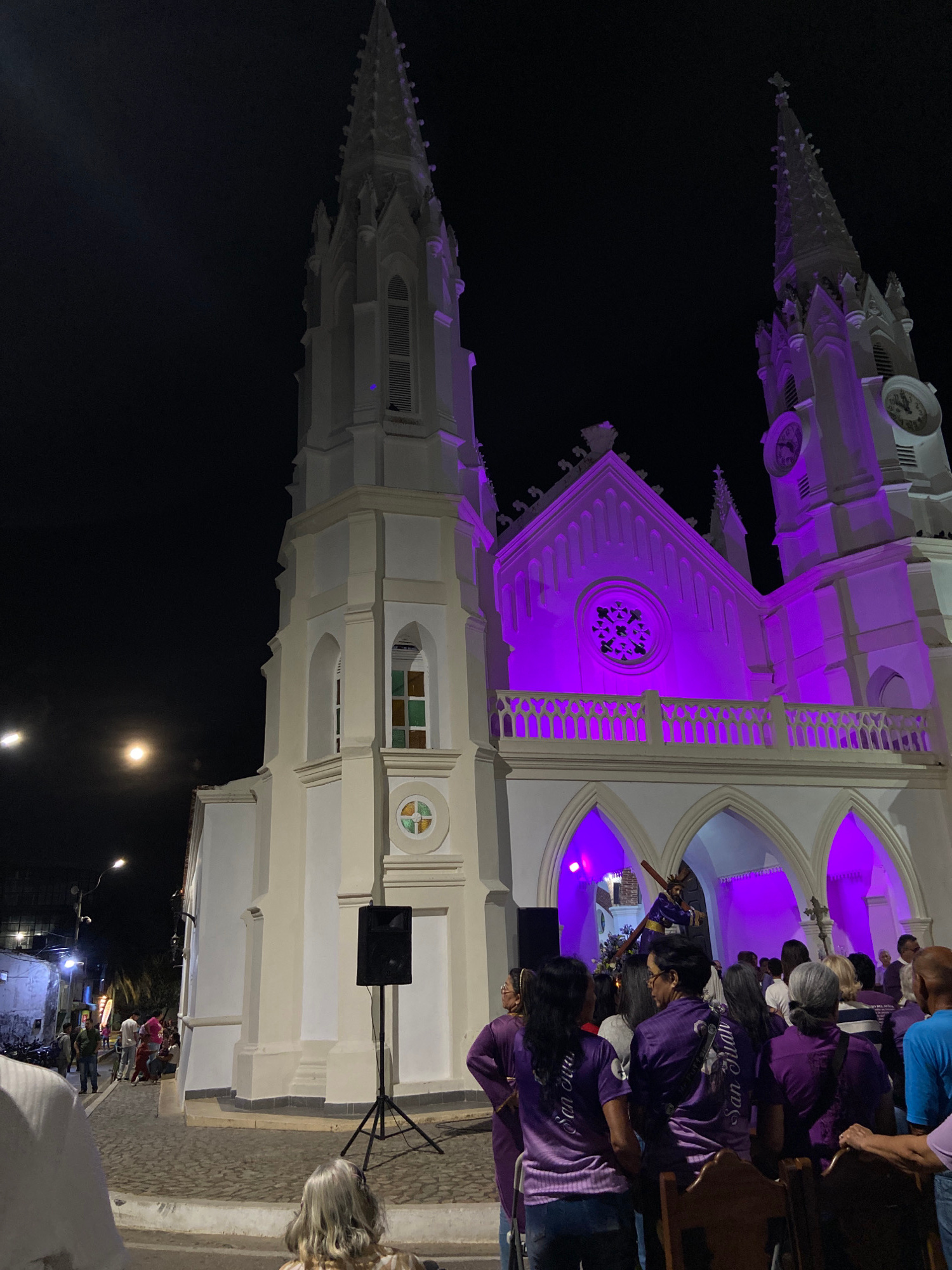 The image shows the Iglesia San Juan Evangelista, a church in Juan Griego, Venezuela, at night. The church is lit with white and purple lights. People wearing purple shirts are gathered at the church.…read more