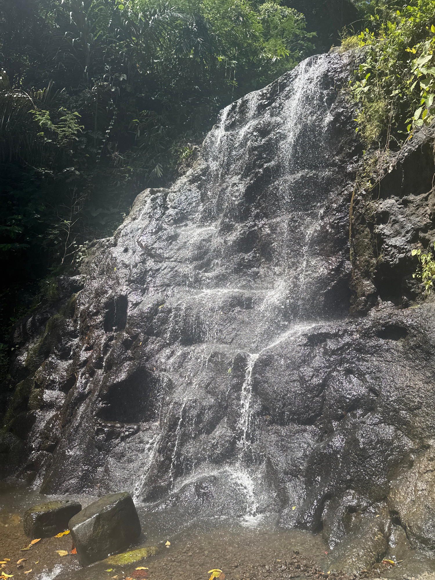 A vibrant waterfall cascades down a dark, textured rock face in a lush natural environment. The scene is illuminated by bright sunlight, reflecting off the glistening water as it flows over the uneven…read more