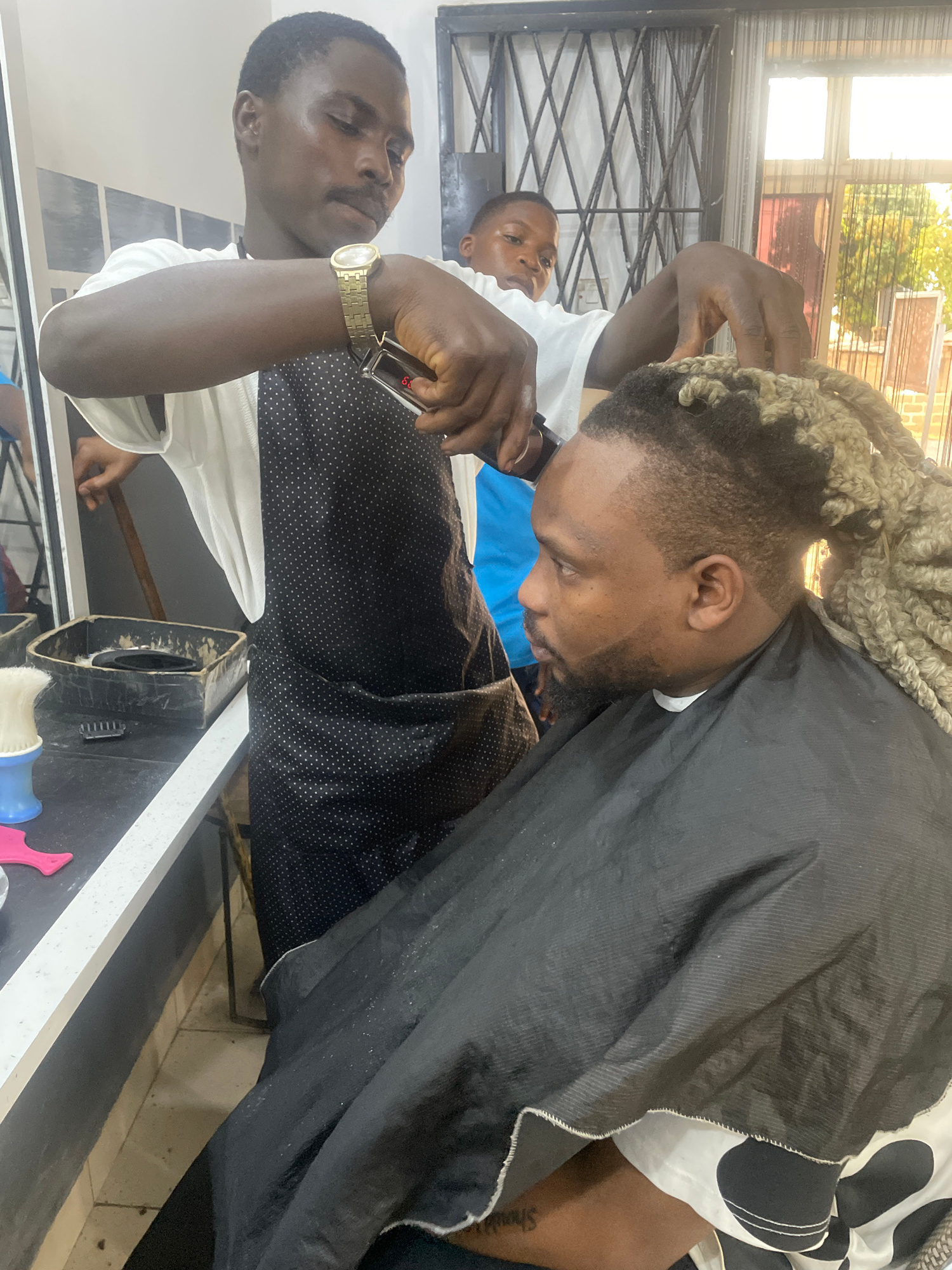 The image shows a man getting a haircut in a barbershop in Jos, Nigeria. The barber, wearing a white shirt and a gold watch, is using clippers on the customer's hair. The customer is wearing a black c…read more