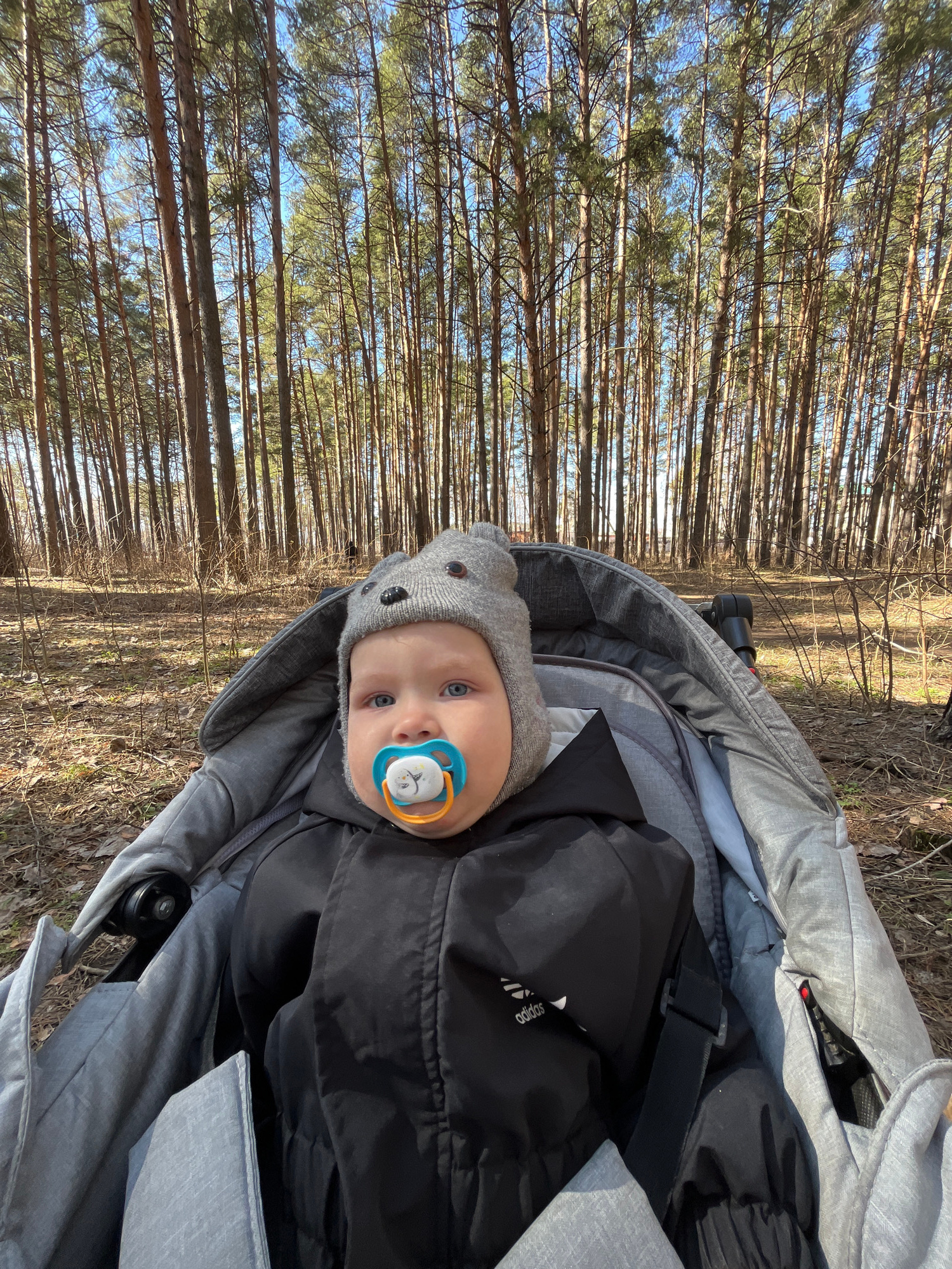 A baby wearing a grey hat and a black jacket is in a grey stroller. The baby has a blue and orange pacifier in their mouth. The stroller is on a dirt path in a forest with tall, thin trees. The locati…read more