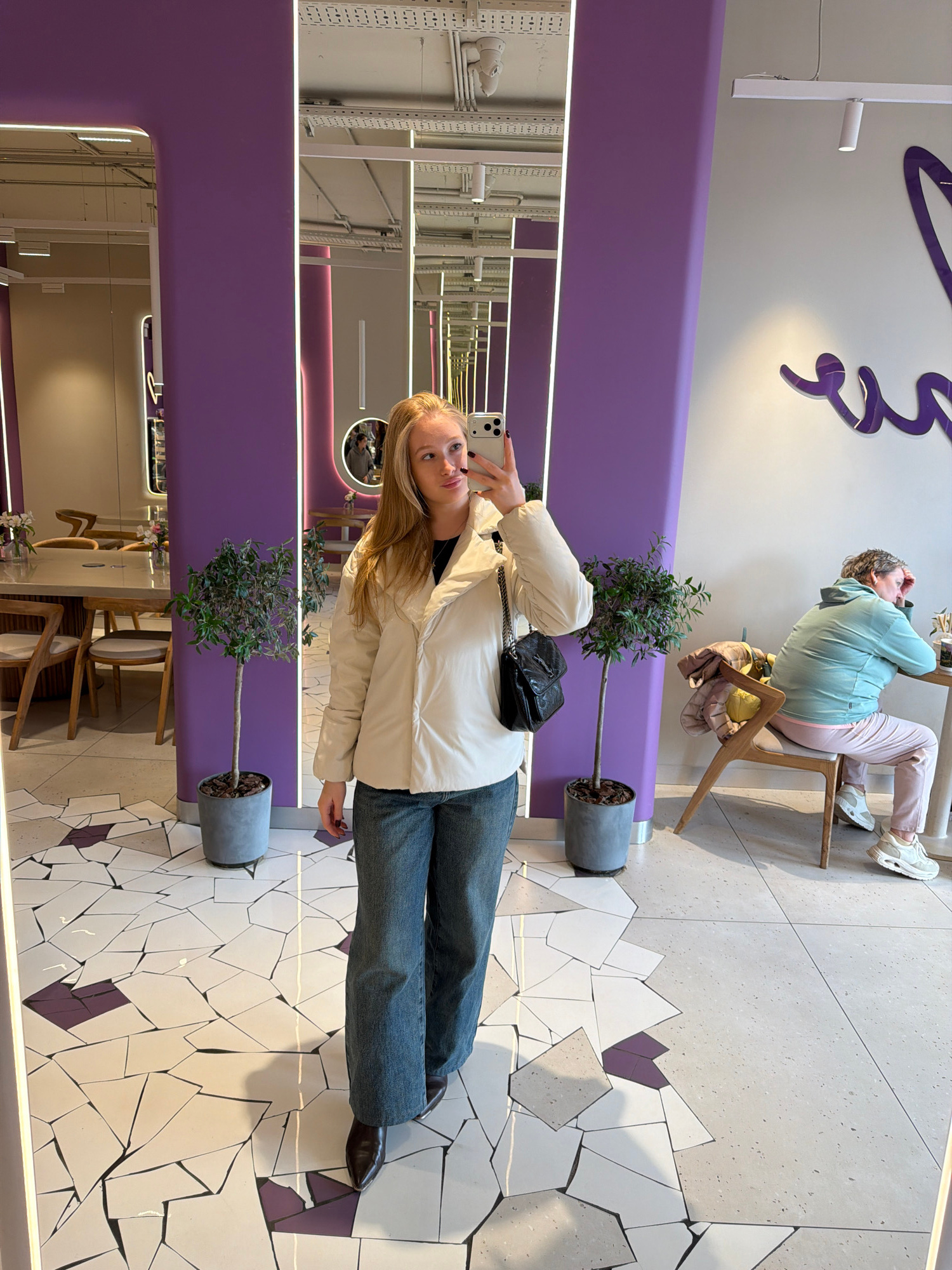 A woman stands in front of a mirror holding a mobile phone, with a purple rectangular border reflecting the surrounding environment. The scene appears to be indoors, possibly a salon or cafe, as sugge…read more