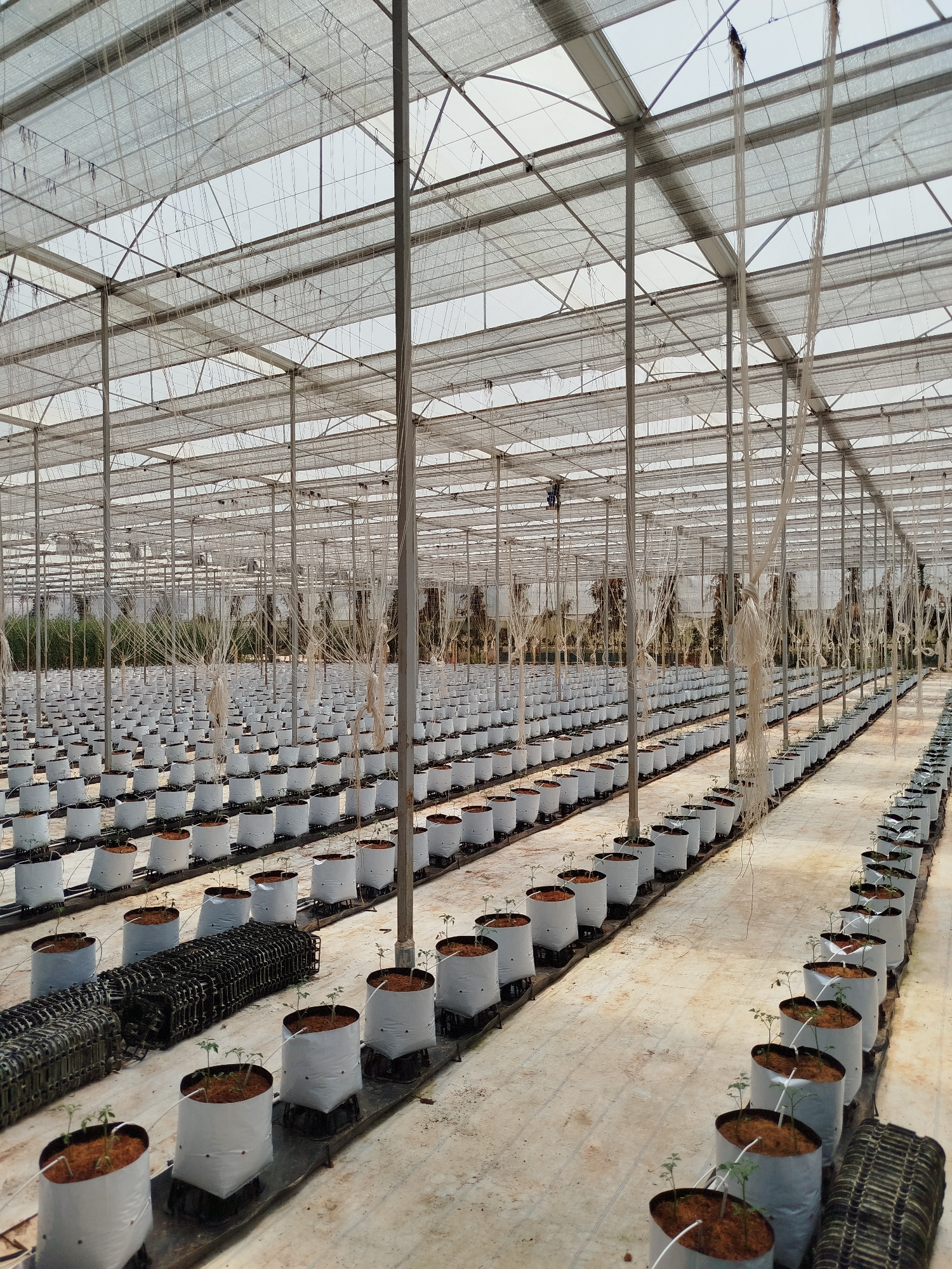 The image depicts the interior of a large greenhouse located in Lang Biang - Da Lat, Vietnam. Rows of white grow bags containing small plants, likely seedlings, are arranged neatly across the floor. T…read more