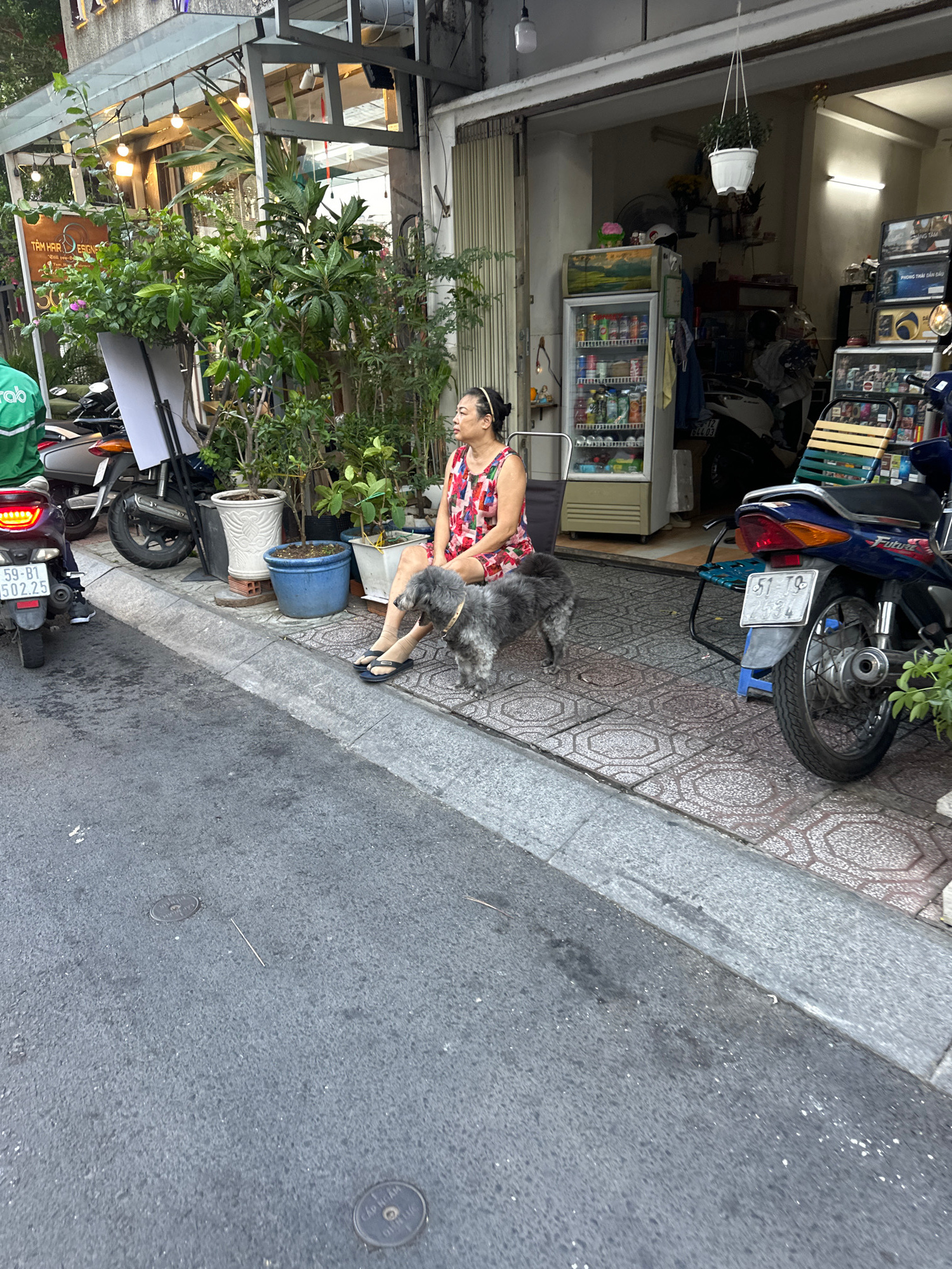 An urban street scene in Thủ Đức, Vietnam, depicts a commercial storefront and sidewalk during daylight. In the foreground, an asphalt road displays two circular metal utility covers and minor debris…read more