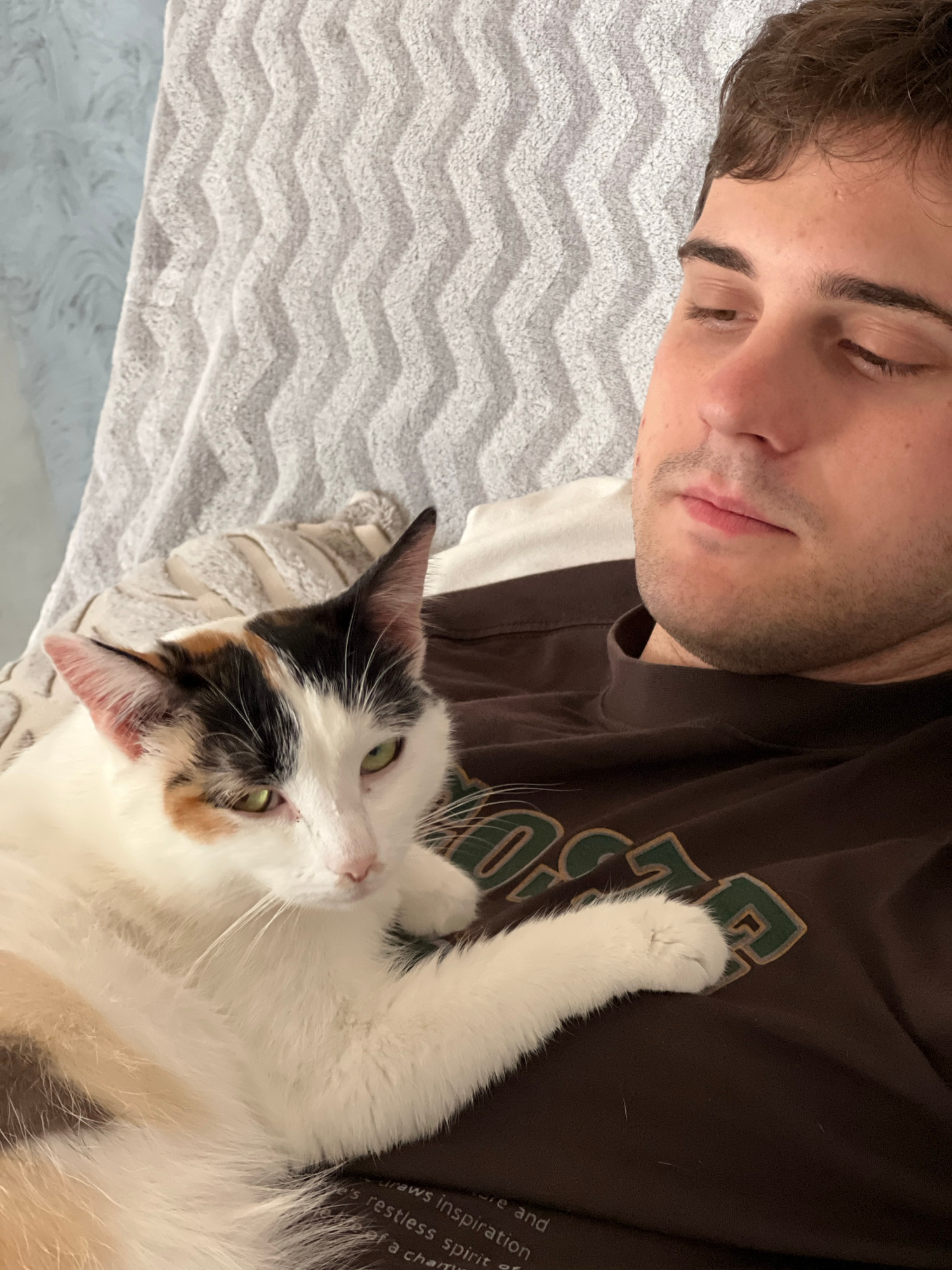 A young man is lying on his back with a cat lying on his chest. The man has fair skin, brown hair, and closed eyes. He is wearing a brown sweatshirt with green lettering. The cat is calico and white w…read more