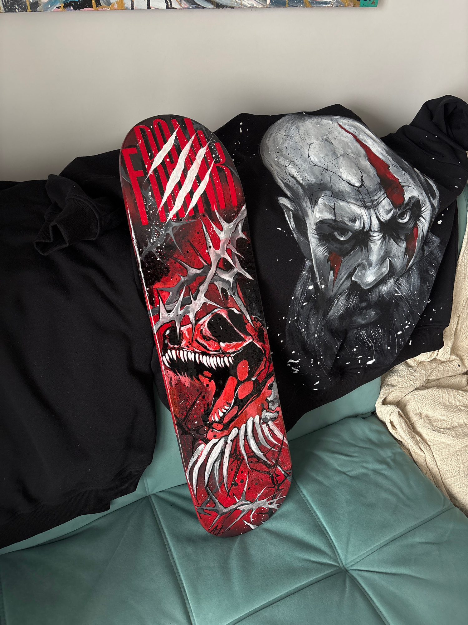 A black hoodie and a custom-painted skateboard, both featuring dark and aggressive artistic designs, are displayed on a bed or sofa. The arrangement highlights two distinct art pieces in an indoor set…read more