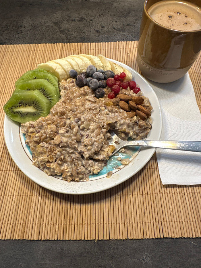 A bowl of oatmeal sits on a bamboo mat with sliced kiwi, bananas, blueberries, and red currants arranged around it. A cluster of almonds rests on top of the oatmeal. A silver spoon is partially submer…read more