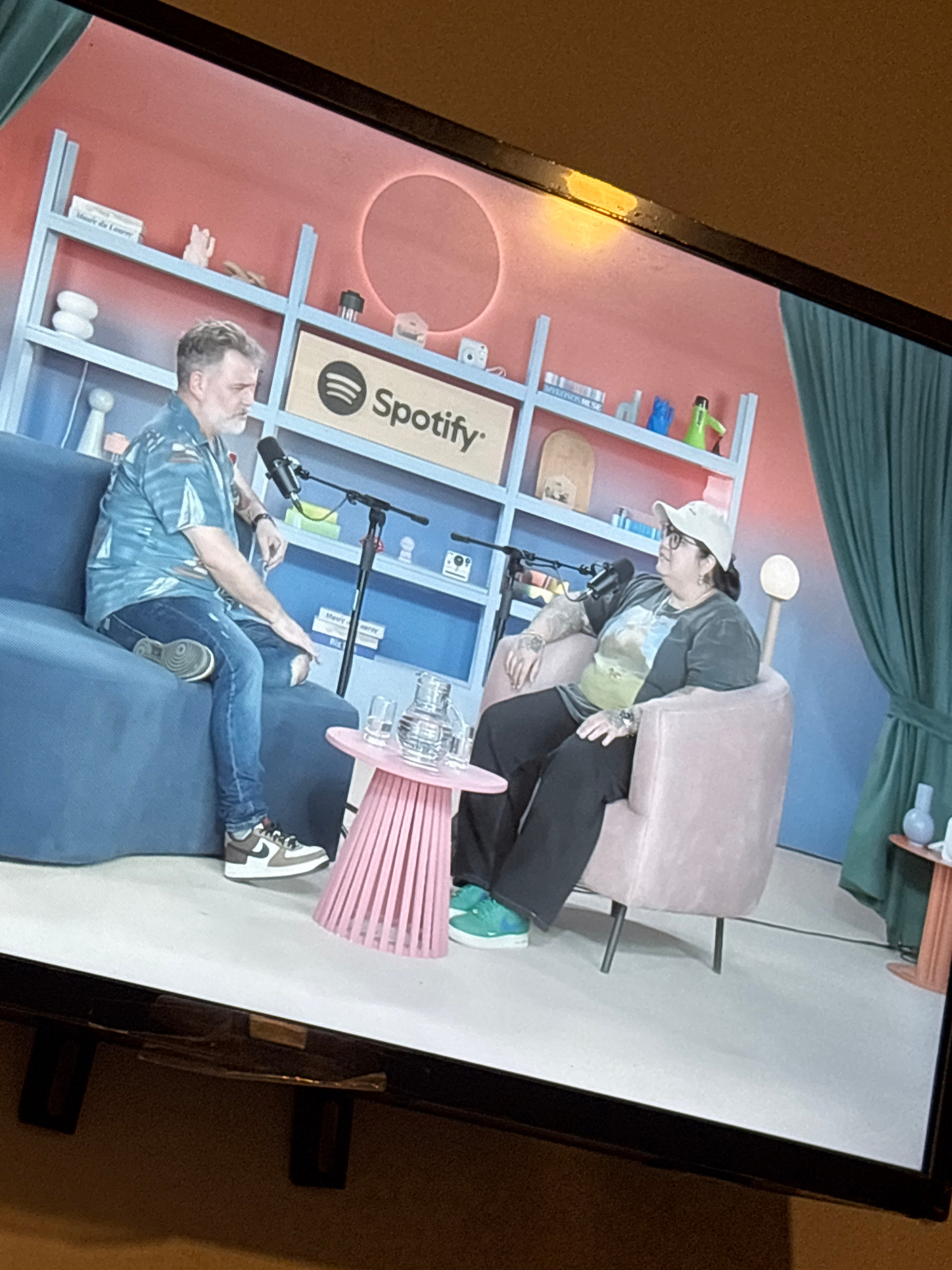 The image shows a television screen displaying a podcast recording with two people. One person is seated on a blue sofa. They are wearing jeans and a patterned shirt. The other person is seated in a…read more