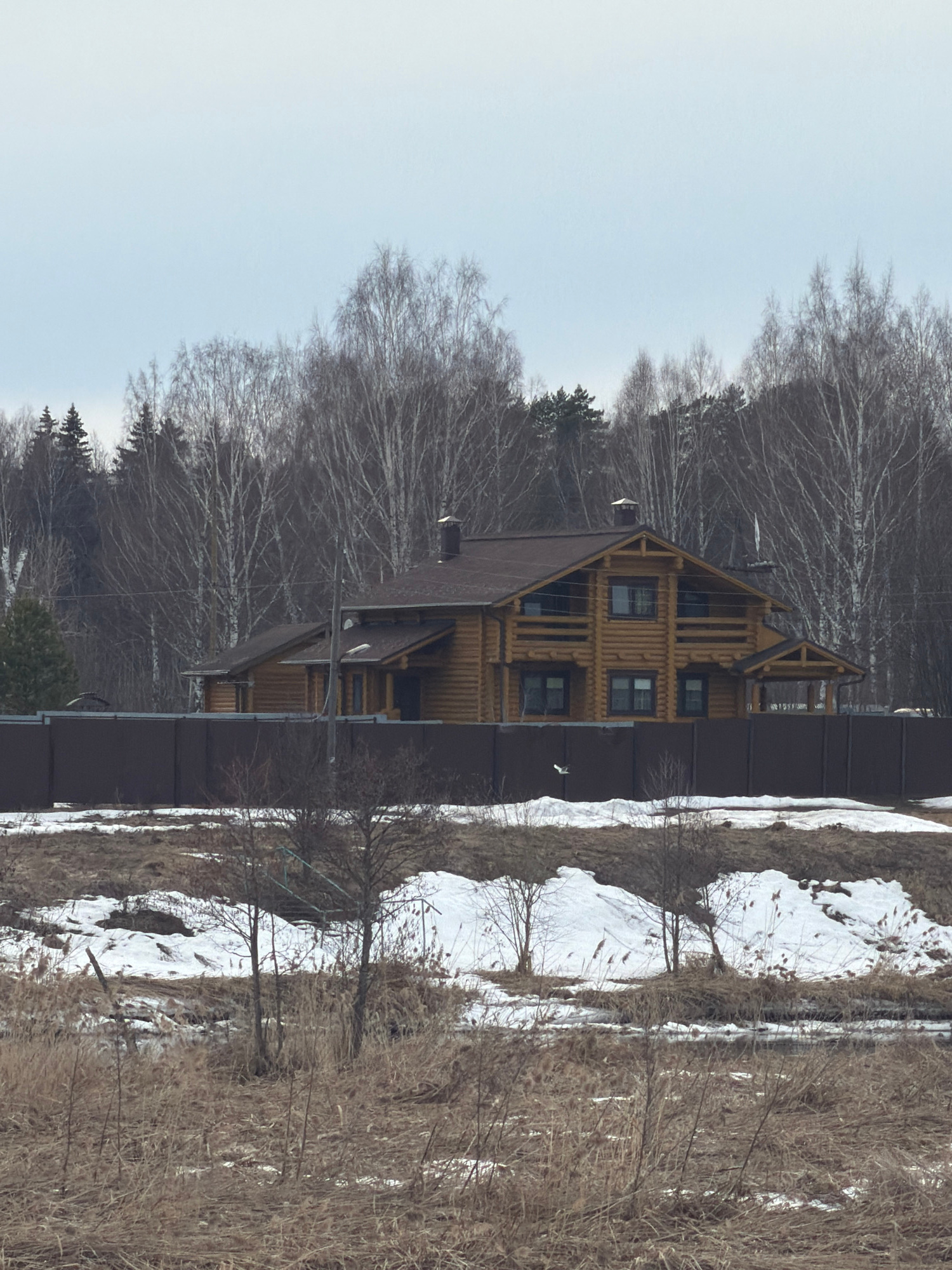 The image shows a three-story log house behind a fence. The house has a brown roof and several windows. The surrounding area includes bare trees, snow, and dried vegetation. The image is rotated 90 de…read more